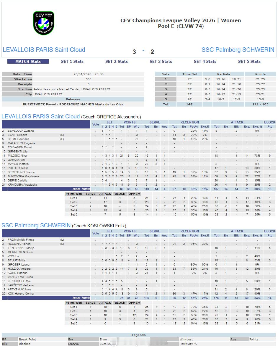 【欧冠女排伊萨屠戮铁路工人什未林2-3败走巴黎】国际排坛战报速递1月28日,欧