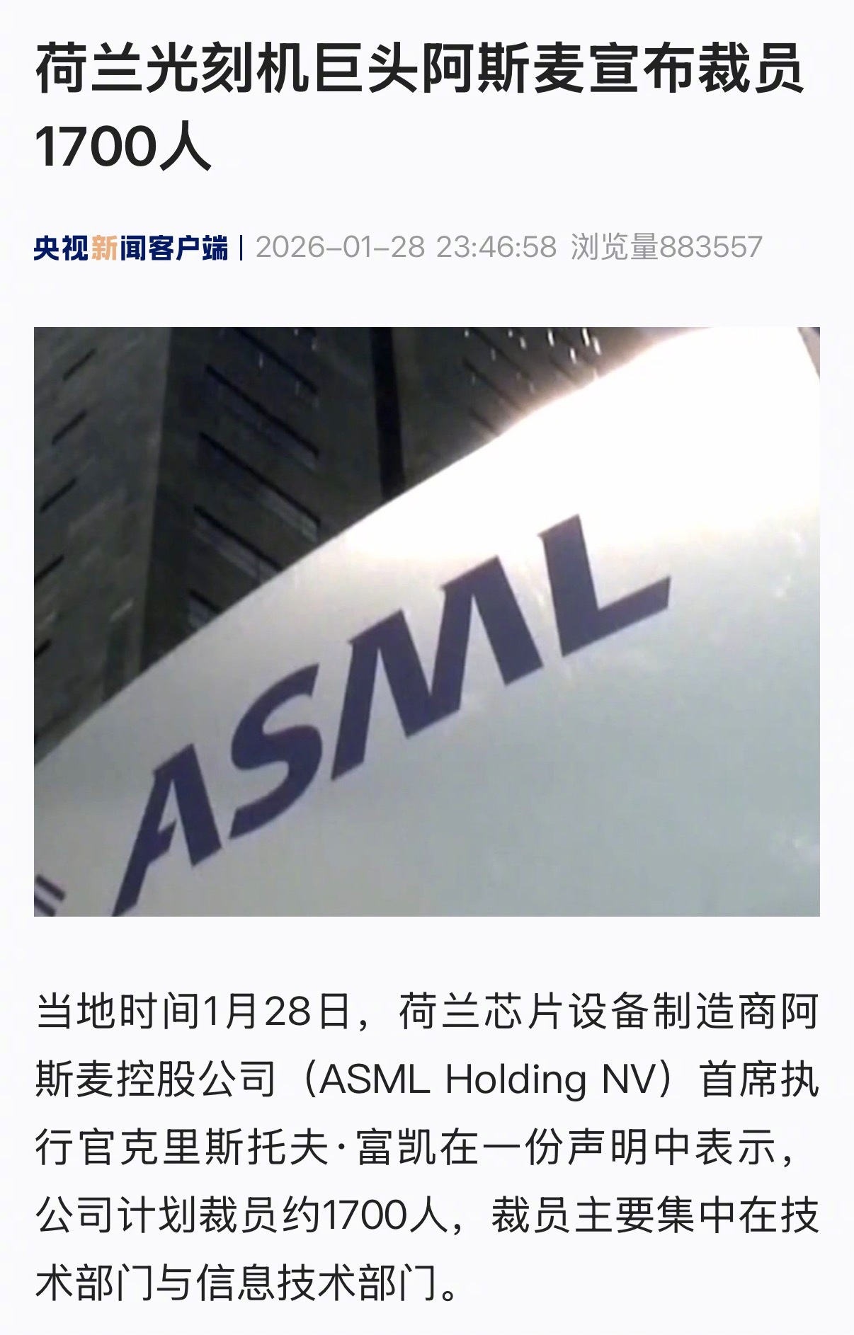 【#阿斯麦宣布裁员1700人#】当地时间1月28日,荷兰芯片设备制造商阿斯麦控股公司(ASML Holding NV)首席执行官克里斯托夫·富凯在一份声明中表示,公司计划裁员约1700人,裁员主要集中在技术部门与信息技术部门。此次裁员对象主要位于荷兰,部分在美国,且主要涉及管理层,裁员人数约占公司员工总数的4%。阿斯麦公司专注于高端光刻机生产,在半导体设备维护翻新业务方面也领先全球。(央视新闻)