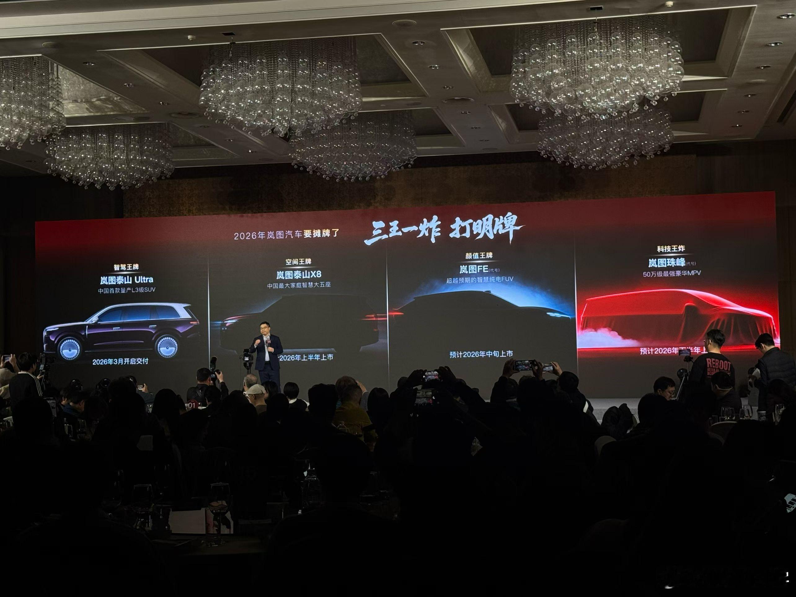 岚图今年四款新车,把关键词也标出来了,这很自信。三月交付泰山Ultra,主打L3级智驾,王牌;上旬泰山X8,主打空间大五座,王牌;中旬岚图FE,纯电FUV,主打颜值,王牌;下旬岚图珠峰,豪华MPV,主打科技体验,炸;有技术旗舰(智驾)、有主流产品(大五座)、有风格化产品(FUV)、有顶级豪华(MPV)……每个区间都要有王牌产品,这确实是明牌了。岚图汽车大v聊车