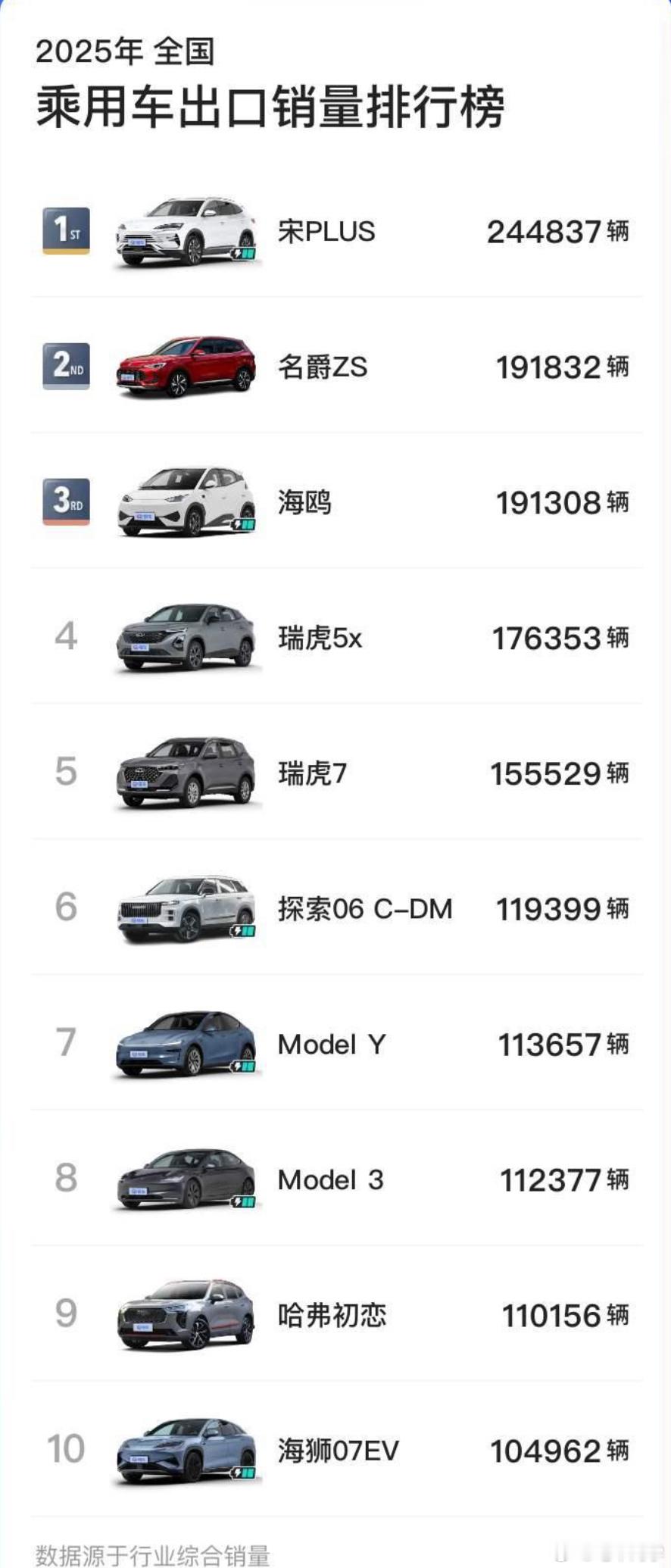 这是2025年全年出口最大的几台车,26年开始,比亚迪奇瑞零跑在欧洲的工厂都会开始下线一些小车,比如海鸥零跑T03A10等,26年中国车的海外销量还会有一个大的提升。