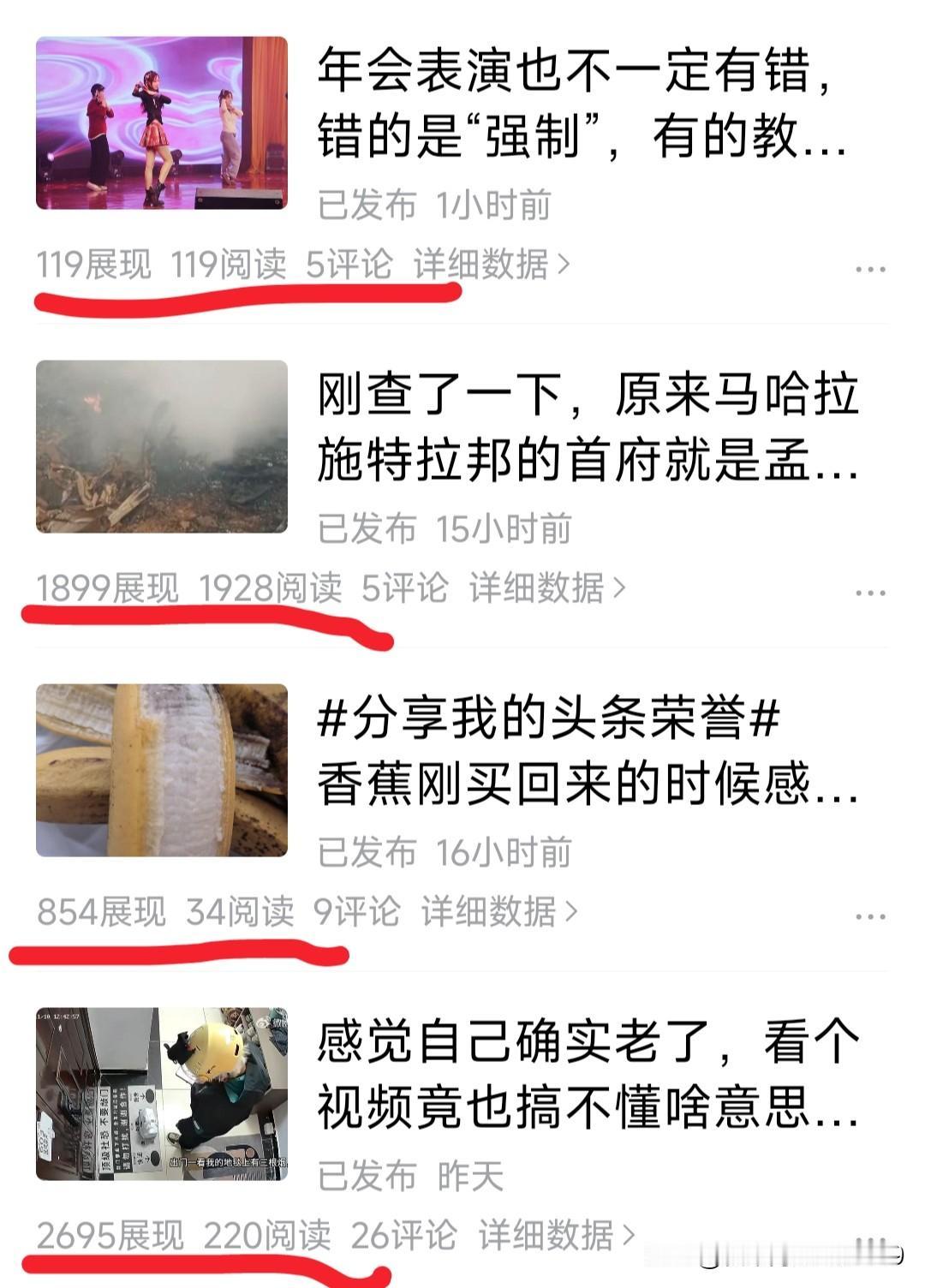 对头条中的数据我是严重怀疑的,以前的时候还要好一些,一篇文章的展现量和阅读量比值大约在1: 4到1: 30之间,最近这一比值有时候特别离谱,就比如今天早晨看到的,展现量有的比阅读量还低。当然,这两天有点忙,作品质量不高,与网友的互动也少,有时候就是即兴感叹一下。可是平台不能因为我的敷衍,就不认真对待关键的数据吧。 我感觉这不是数据异常,这像是平台在跟我开玩笑,它在告诉我: “你的作品不需要被人看见,而只证明被平台收录过。可那些真实的阅读,那些深夜里与我共鸣的灵魂,难道也要被算法随意揉捏吗?