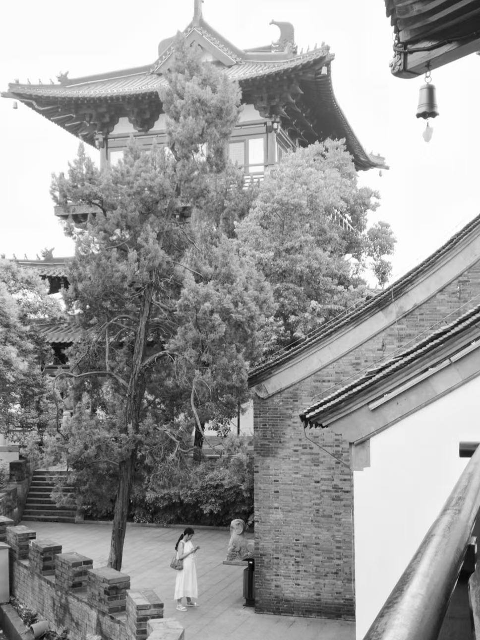 古建的飞檐驮着光阴,苍树把影子泼在砖墙上,白衣似一片云,落在了岁月的褶皱里。 🏯 瓦檐、砖壁与老树枝蔓交织,将时空拧成默片,檐角的风铃声,是历史漏下的,细碎回响。 🌳 松柏撑着苍绿的伞盖,替古楼滤过喧嚣,白衣人影走过时,像给这帧旧画,添了笔鲜活的留白。