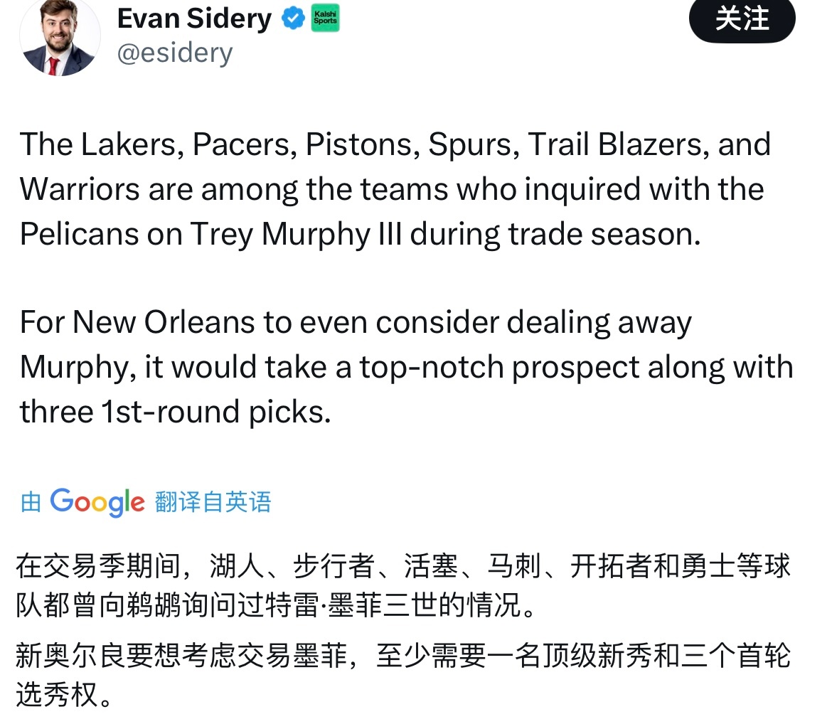 记者Evan Sidery报道:“马刺、湖人、步行者、活塞、开拓者和勇士等队都曾向鹈鹕询问墨菲的交易情况鹈鹕方面至少需要一名顶级新星和三个首轮选秀权。”超话创作官 |篮球年末狂欢季 |nba交易