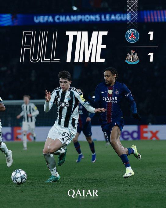 欧冠巴黎1-1纽卡,双方同进附加赛:巴黎第11名(种子队),纽卡第12名(非种子