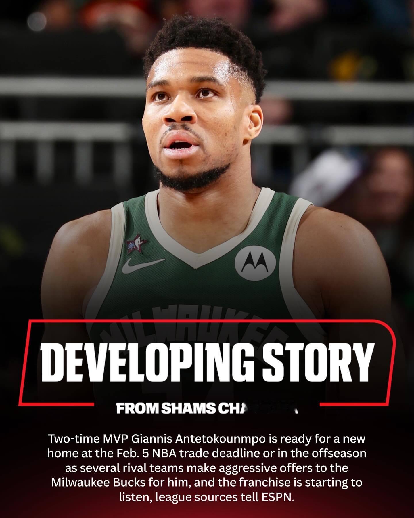 【字母哥决定离开雄鹿!勇士积极追求】Shams的权威爆料来了!字母哥已经向雄鹿表明,他认为在合作12年多后,现在是时候分道扬镳了,这使得字母哥被交易的可能性越来越大。今年31岁的字母哥有资格在10月签下一份4年2.75亿美元的超级顶薪合同,如果没有签约,他也可以通过放弃6280万美元的球员选项,在2027年休赛期成为完全自由球员。雄鹿在任何涉及字母哥的交易方案中,都要求获得一名顶级新秀和大量选秀权。若下周交易截止日(2月5日)前未能满足对字母哥的要价,雄鹿方面愿意将交易推迟至夏季进行。现在有几支球队比较感兴趣,热火、森林狼、尼克斯和勇士都是字母哥的认真追求者。勇士愿意提供以库明加和巴特勒为核心、并附带选秀权的交易方案,以换取字母哥。但勇士比较麻烦的是,她们在2027和2029年没有可用于互换的选秀权。这笔交易很可能需要第三方球队提供一些小帮助来推进。