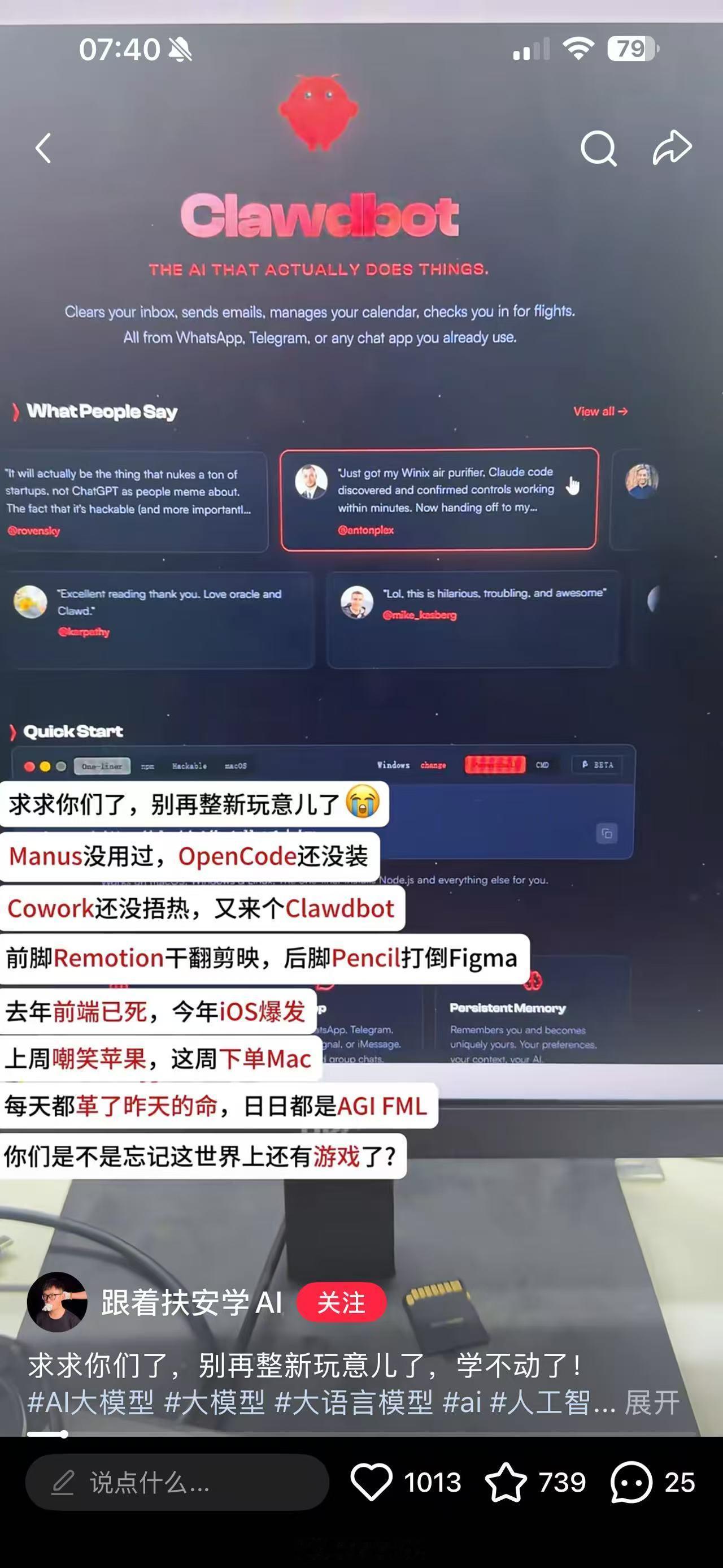 关于AI的焦虑,我的心情和此图一模一样。前一个AI工具还没暖热,第二个还来不及学,第三个就出来了。真的赶不上啊,感觉自己已经落后于时代了。
