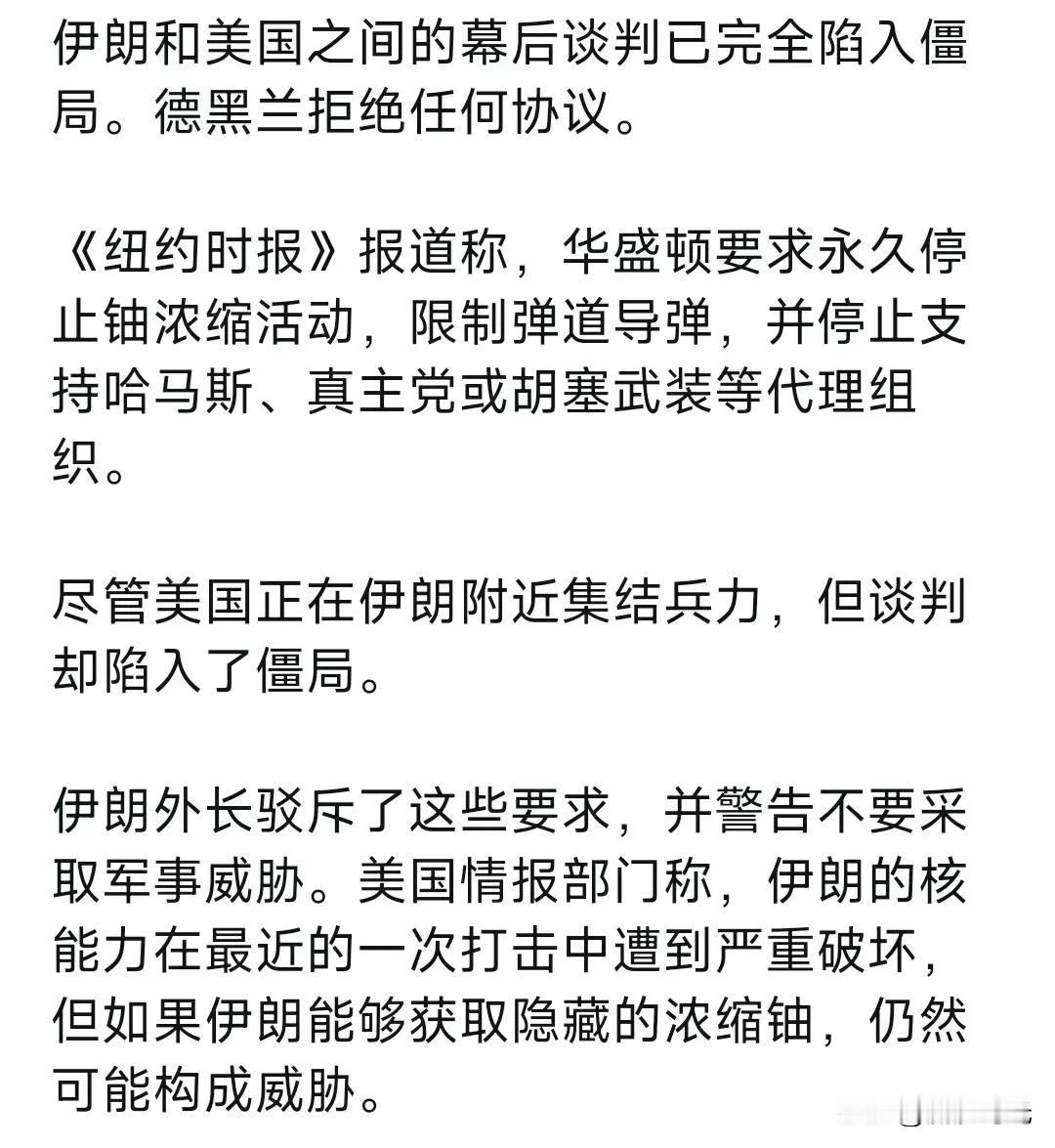 伊朗和美国之间的幕后谈判已完全陷入僵局。 德黑兰拒绝任何协议。 《纽约时报》报道称,华盛顿要求永久停止铀浓缩活动,限制弹道导弹,并停止支持哈马斯、真主党或胡塞武装等代理组织。 尽管美国正在伊朗附近集结兵力,但谈判却陷入了僵局。 伊朗外长驳斥了这些要求,并警告不要采取军事威胁。 美国情报部门称,伊朗的核能力在最近的一次打击中遭到严重破坏,但如果伊朗能够获取隐藏的浓缩铀,仍然可能构成威胁。