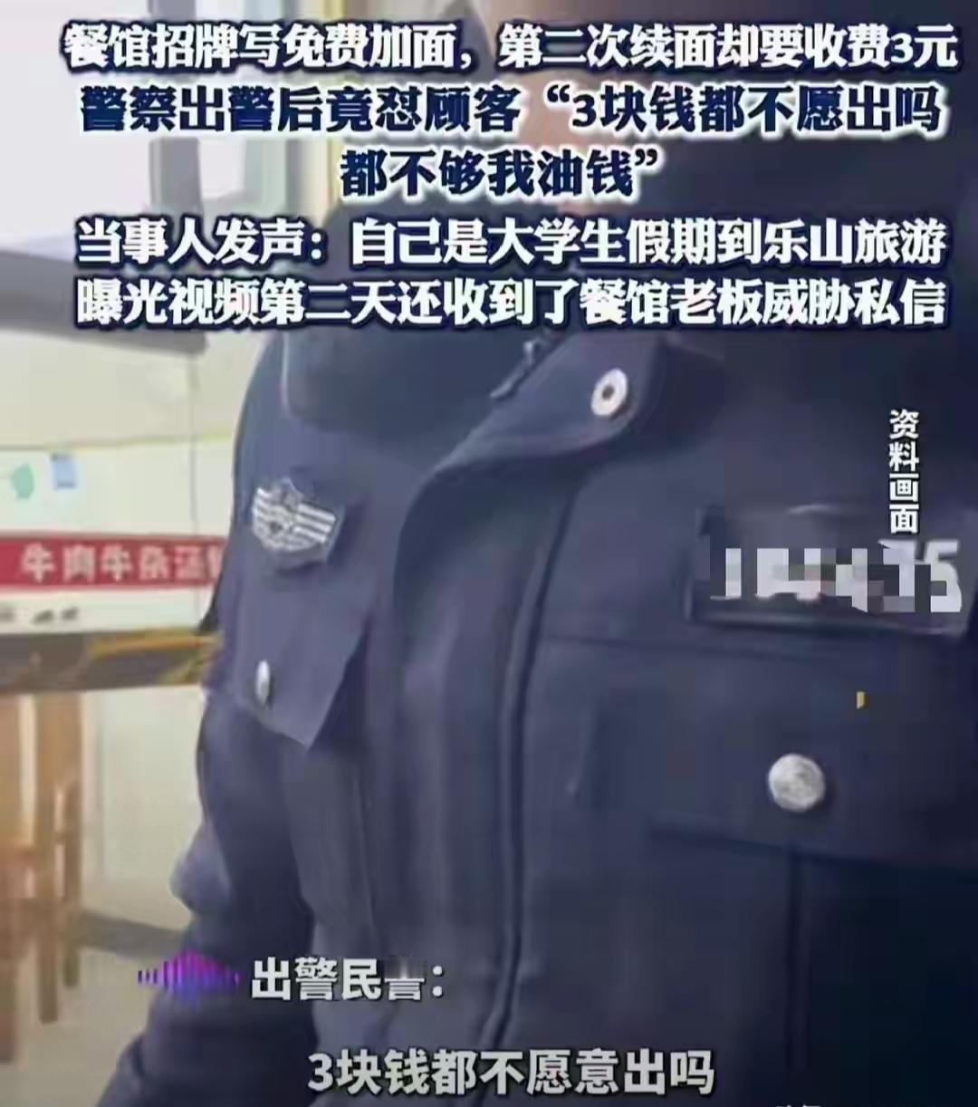 这是公说公有理婆说婆有理,乐山人还是很热情的,但是就续面来说,这只能算是一个营销手段。 在四川来说,续面的人少之又少。有续面的顶多也是一次而已,十块钱一碗面,你还多次续面。别人也是需要成本的。如果几天没吃饭,你一直续面,别人商生意做不做了? 作为顾客来说,真正的饭量大,没吃饱,看到这样的招牌,想续面第二次,也是正常的,因为上面也没有写续面几次。这可能就是外地人的文化差异。 民警作为调解矛盾的,为人民服务的人员,说出“还不够我油钱”这些话,也是实属不应该。有困难,有矛盾找警察,不能因为是几块钱的事,而这样去对待外来人员。应该道歉,接受处罚。