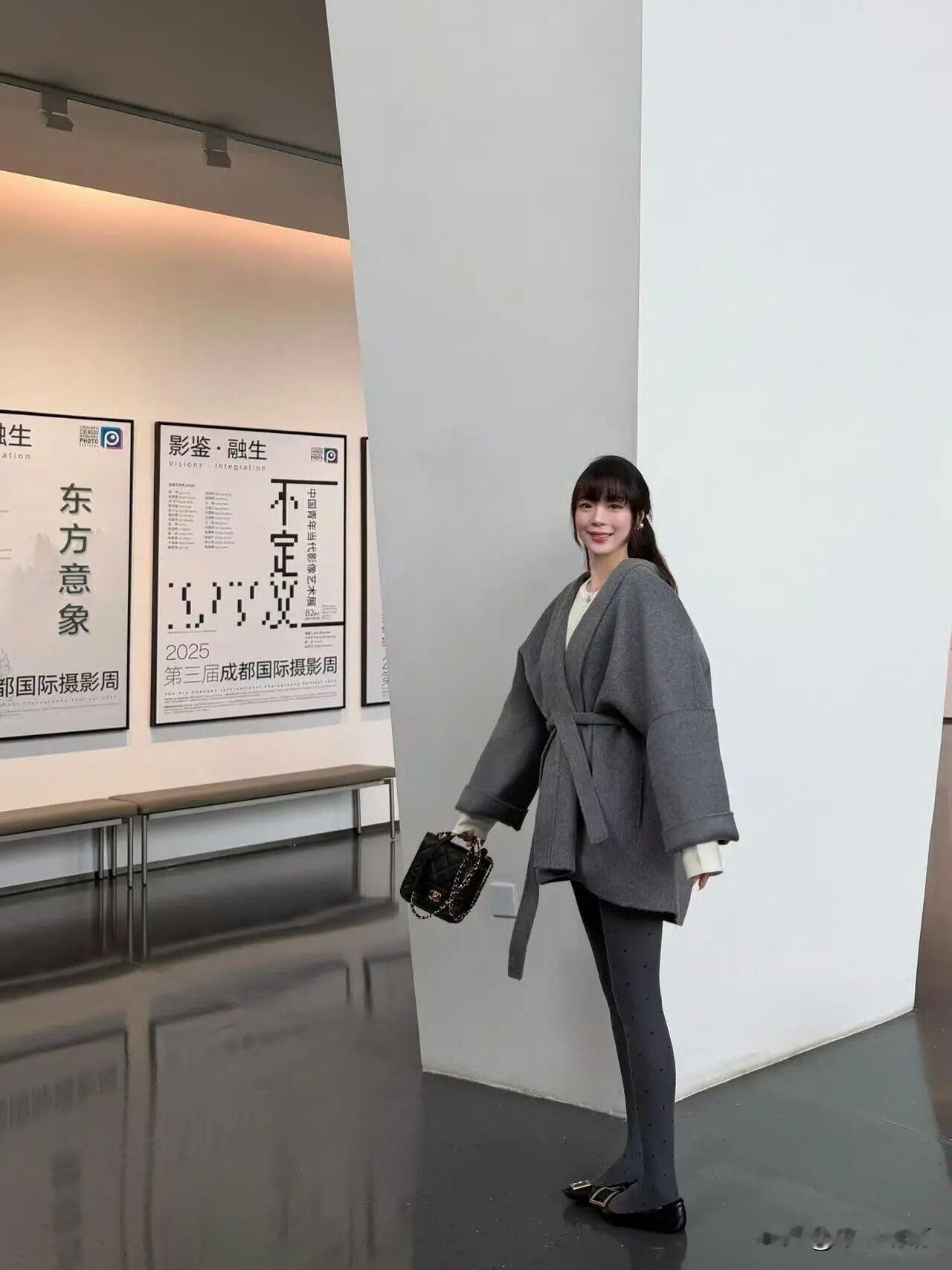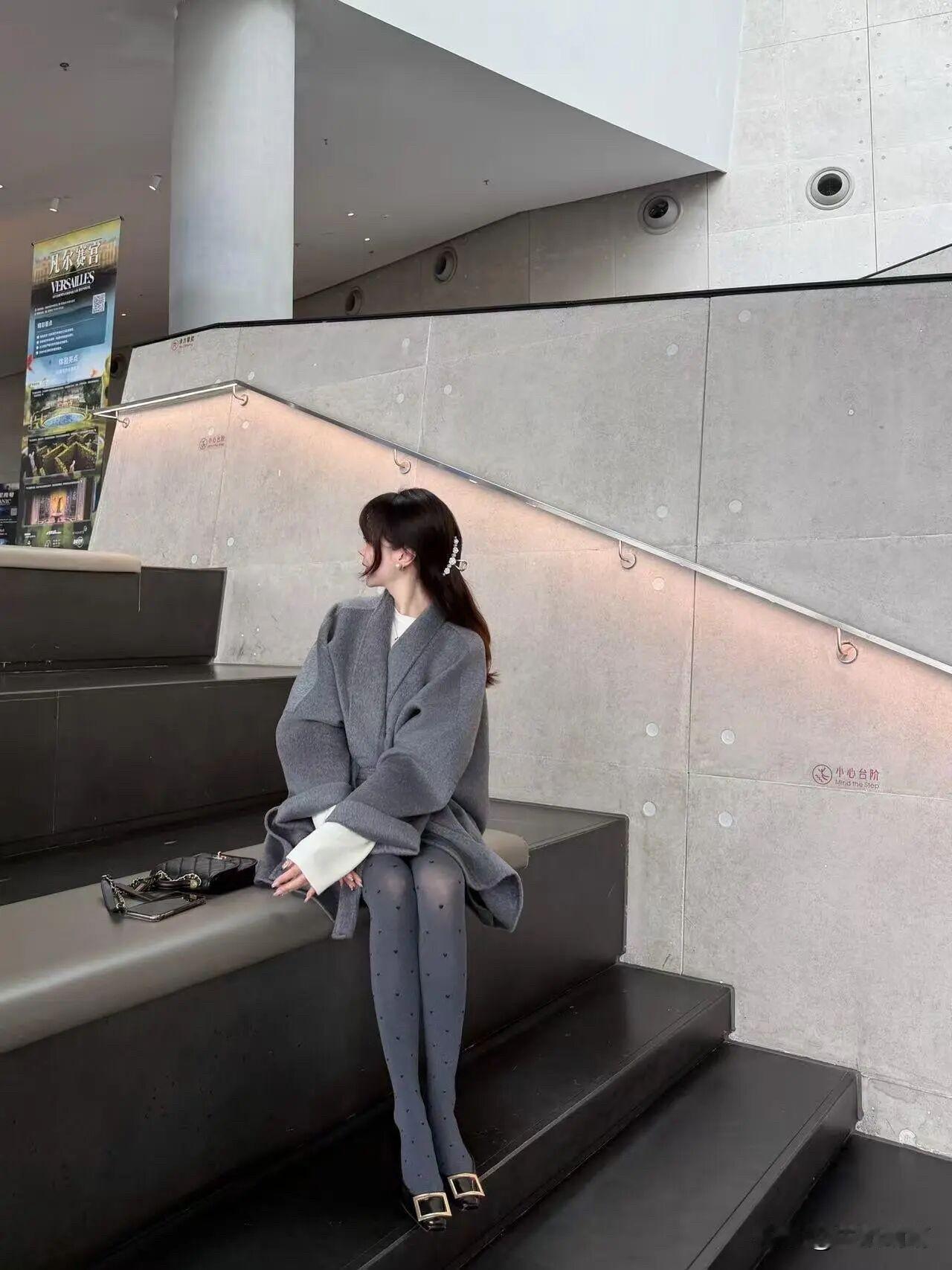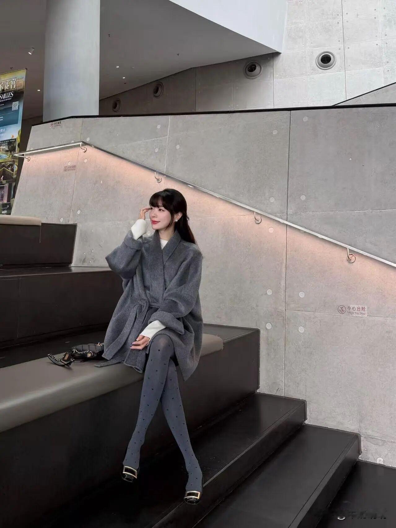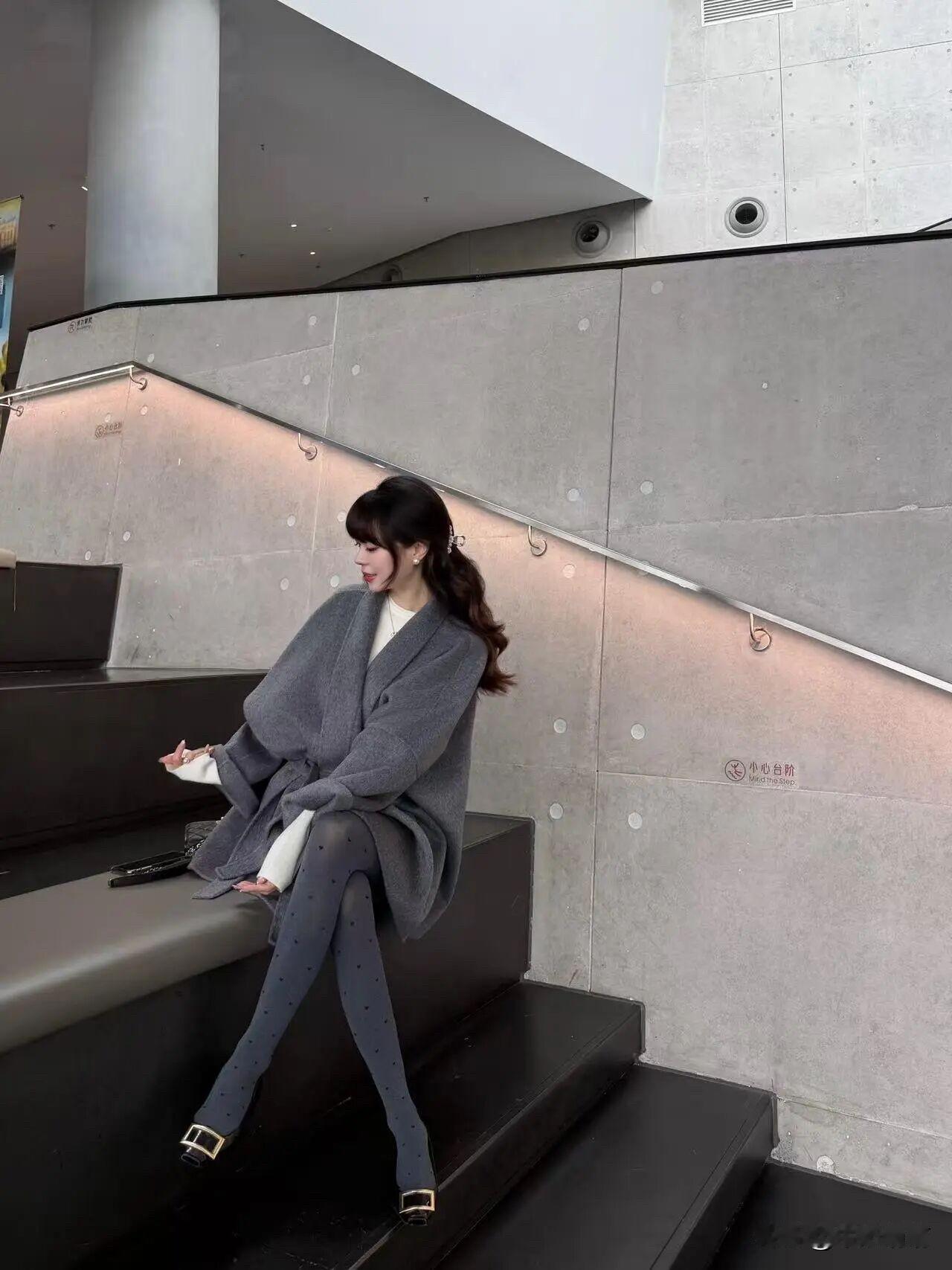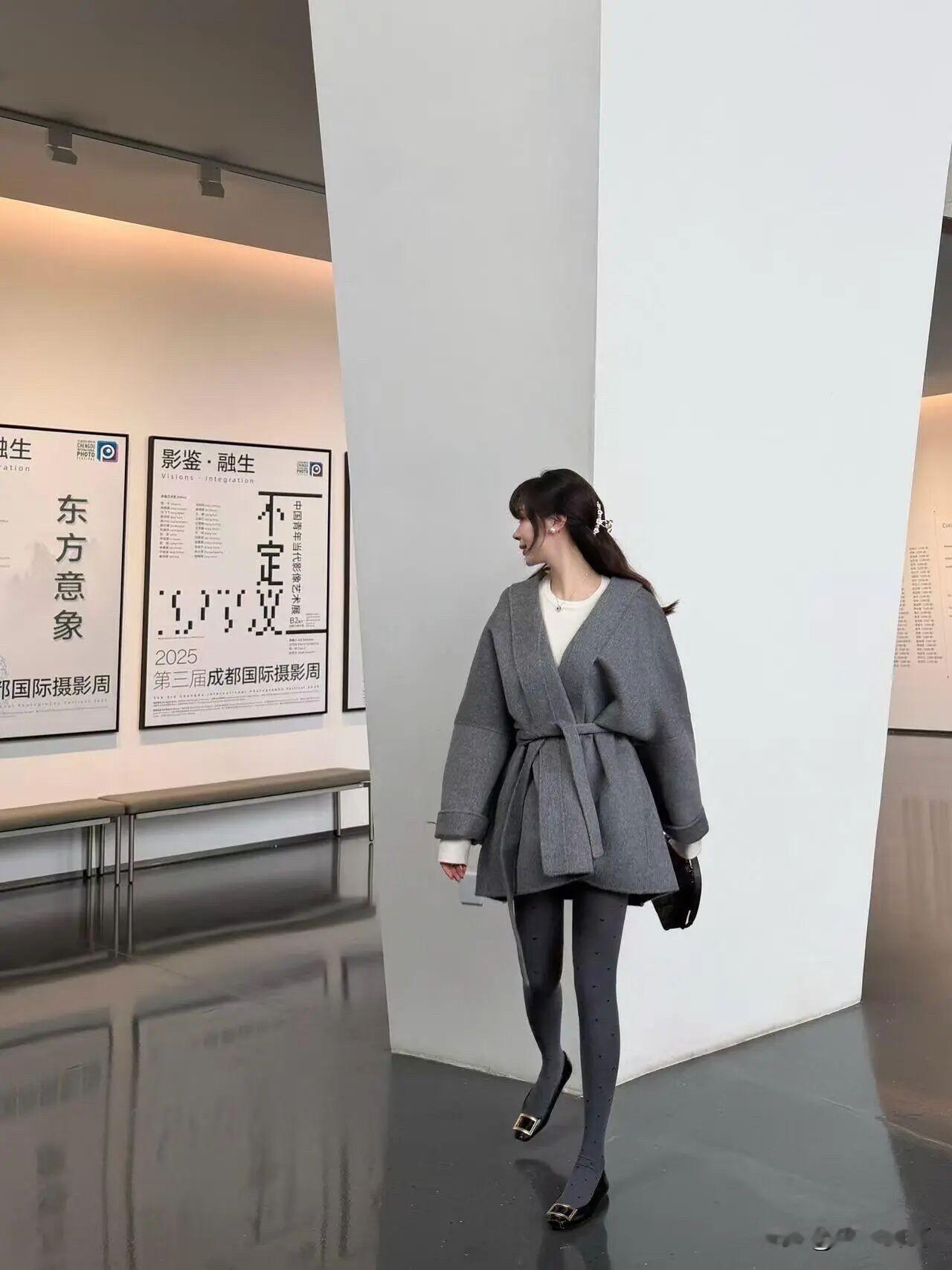 灰色大衣配灰波点袜,优雅温柔与灵动巧妙交织。灰色大衣,柔和似暮色轻纱,内搭白色,澄净如晨露。波点袜子,点点若细雨洒落,激起涟漪般趣味。