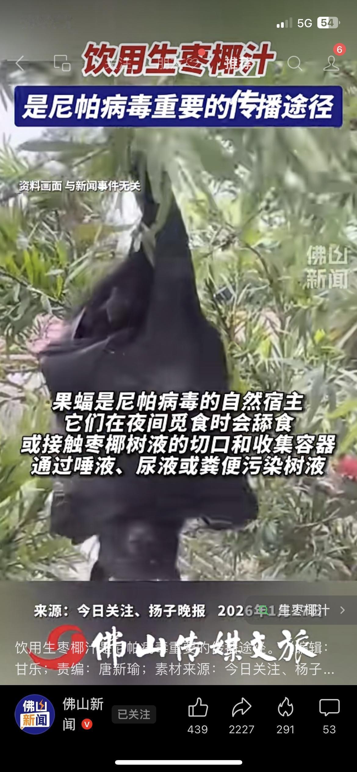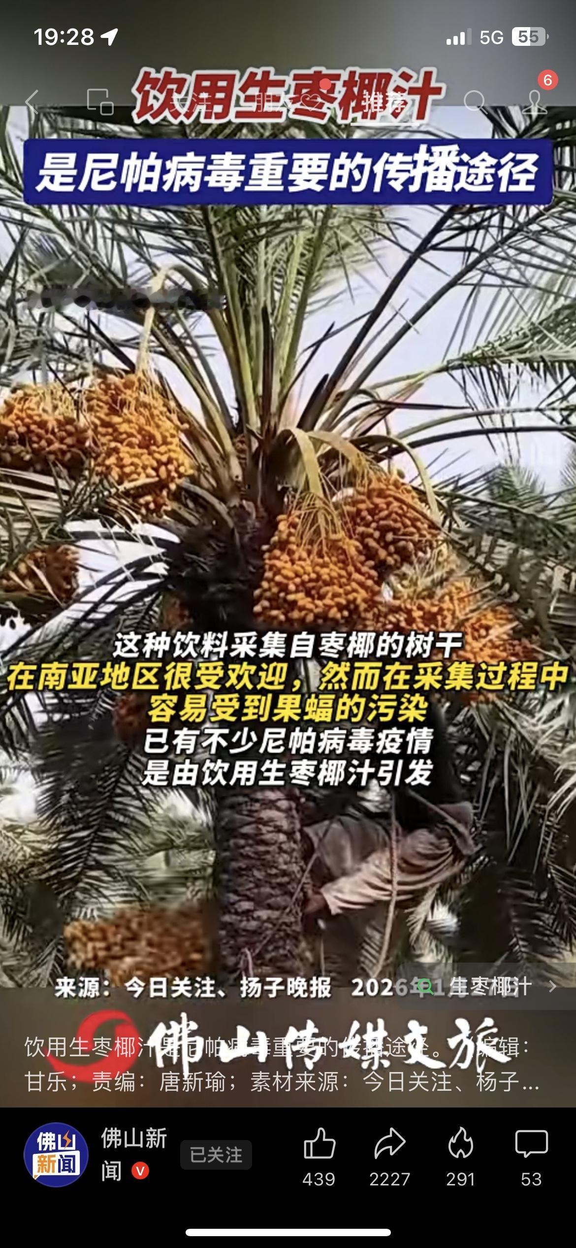 世卫提醒!尼帕病毒竟靠这个传播,出门在外一定要避开! 很多人不知道,生椰枣汁是尼帕病毒的重要传播渠道,南亚多地的疫情都跟这个有关——果蝠会舔食椰树切口,唾液尿液里的病毒直接混进椰汁,喝生的就有感染风险。 咱国内目前没有病例,但不管是去南亚旅行,还是日常吃进口生鲜,都别碰生的!水果洗干净削皮,才是最稳妥的。 快把这个防护点转发给家人,出门在外别乱喝生榨饮品!你还知道哪些生鲜防护小知识? 尼帕病毒 旅行防疫 健康科普