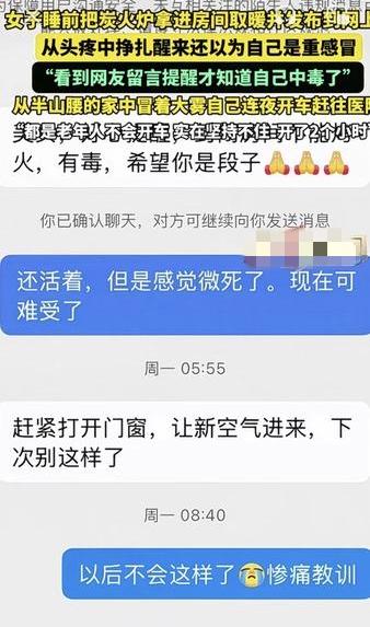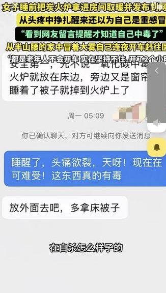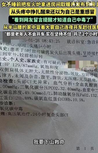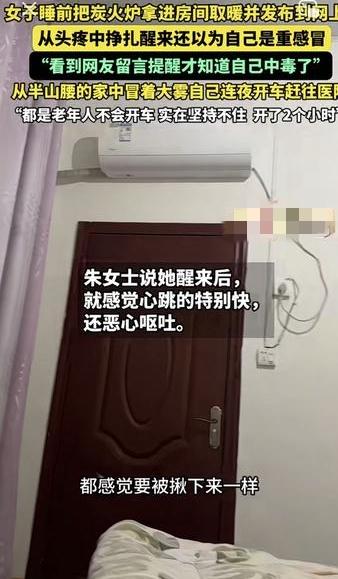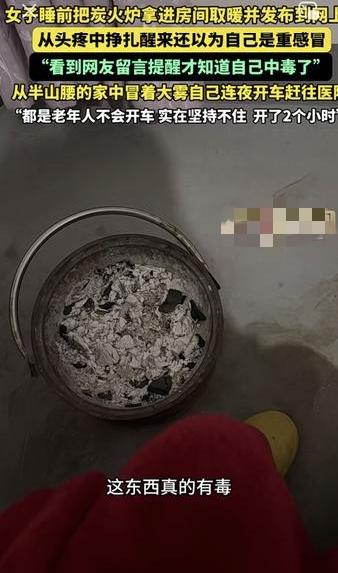 太危险了!湖南张家界,一女子回山区老家觉得冷,于是晚上睡前,女子就把炭火炉拿进房间取暖并发布到了网上,可女子睡着睡着,就觉得心跳加速,头疼得挣扎醒来。起初她还以为自己是重感冒,后看到网友的留言提醒,她才知道自己是中毒了!无奈,女子只得强忍不适,从半山腰的家中冒着大雾,自己连夜开车赶往医院。 据女子表示,她一直在外地工作,而这次刚回到老家就有点小感冒,由于山区较冷,于是她就把火炉拿到了房间里取暖。但正是这从小到大烤的炭火,看似没什么危险,这次却差点要了她的命! 庆幸,女子烤炭火前将此事发到网上,后又因剧烈头疼醒了过来,并翻阅了网友们在评论区的留言,这才看到网友们的提醒。 而网友们的这些留言,也是让女子意识到,自己头疼恶心等症状不是感冒加重了,而是一氧化碳中毒了! 无奈,女子家里周边全是老年人,根本无人会开车,身体越来越难受的她,只得自己顶着大雾天开车2个小时来到了医院就医。 果然不出网友们所料,女子这真是一氧化碳中毒,好在通过医生的及时治疗,女子已经脱离了生命危险。事后她也将此事发到网上,警惕大家,千万不要在屋内用炭火取暖! 医生提醒,‌在屋内使用炭火取暖是极其危险的行为,主要原因在于炭火燃烧不充分时,会产生大量‌一氧化碳‌。这是一种无色、无味、无刺激性的“隐形毒气”,极易在密闭空间内积聚,导致中毒甚至危及生命。 而一氧化碳剧毒难以察觉‌,这种气体无法通过人的感官(眼、鼻、喉)察觉,中毒往往在不知不觉中发生。当人吸入后,一氧化碳会与血液中的血红蛋白结合,其亲和力是氧气的200至250倍,从而阻止氧气运输,造成全身组织缺氧。导致其出现头晕、恶心、呕吐、意识模糊等症状,甚至昏迷。‌ 且一氧化碳中毒初期出现的头痛、头晕、乏力、恶心等症状,常被误认为是感冒、疲劳或睡眠不足,导致延误最佳抢救时机。‌ 所以绝对禁止‌在卧室、浴室、密闭客厅等空间使用炭火取暖。也建议在家中安装‌一氧化碳报警器‌,在浓度超标时及时发出警报。 倘若在屋内取暖时,一旦发现有人出现头晕、恶心等症状,应立即‌开窗通风、转移至室外,拨打120‌,并尽快送医接受‌正确治疗。 正所谓,事教人一次就会,相信女子经历这次的事情后,想必以后都不敢在屋内炭火取暖了吧。不过像女子这种情况,为了安全起见,还是不建议自己驾车去医院,应该立即拨打急救电话寻求帮助。
