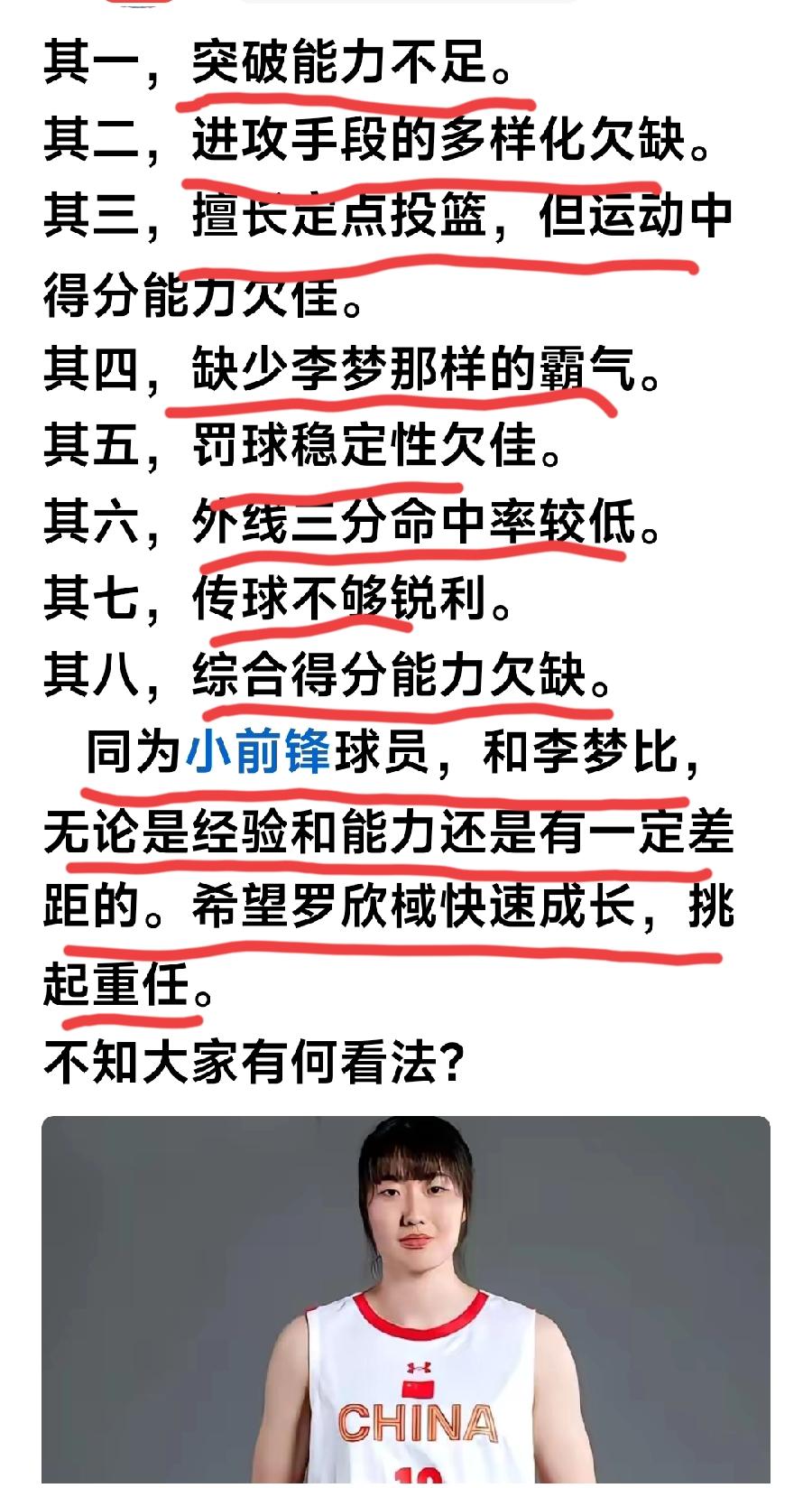 罗欣棫与李梦的差距,说白了就是球感的差距。 会打篮球的人都知道,球感好不好是打好篮球的关键,有的人球感后天可以练出来;但有的人天生球感就好,罗欣棫属于前者,李梦属于后者。 罗欣棫正当打之年,技术基本定型,很难再有质的飞跃,想要达到李梦的高度不太可能。而另一个小将杨舒予,从她在球场上的表现来看,很有可能达到李梦那样的高度。 天赋这东西有的人天生就有,两个先天条件相同的人去做相同的事,效率往往不同,也许这就是罗欣棫与李梦的差距,有时靠后天的努力去补救也无法企及的。 其实罗欣棫没必要刻意去做下一个李梦,做一个真实的自己才是最好。