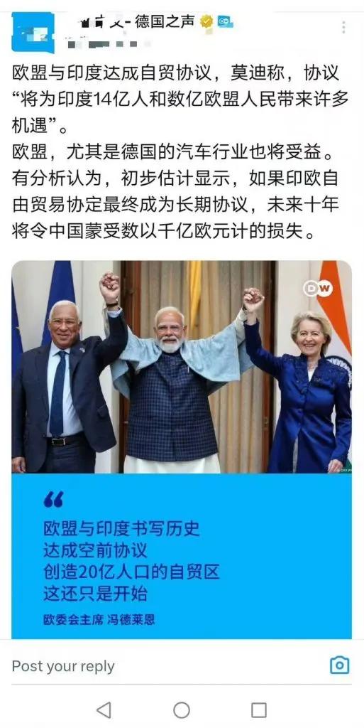 欧盟和印度达成自贸协议,双方都很兴奋,声称未来10年将让中国遭受数以千亿欧元计的
