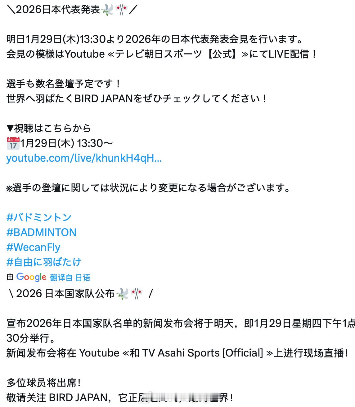日本羽协将在当地时间1月29日13点30分召开新闻发布会,公布2026年度国家队人员名单我爱羽球