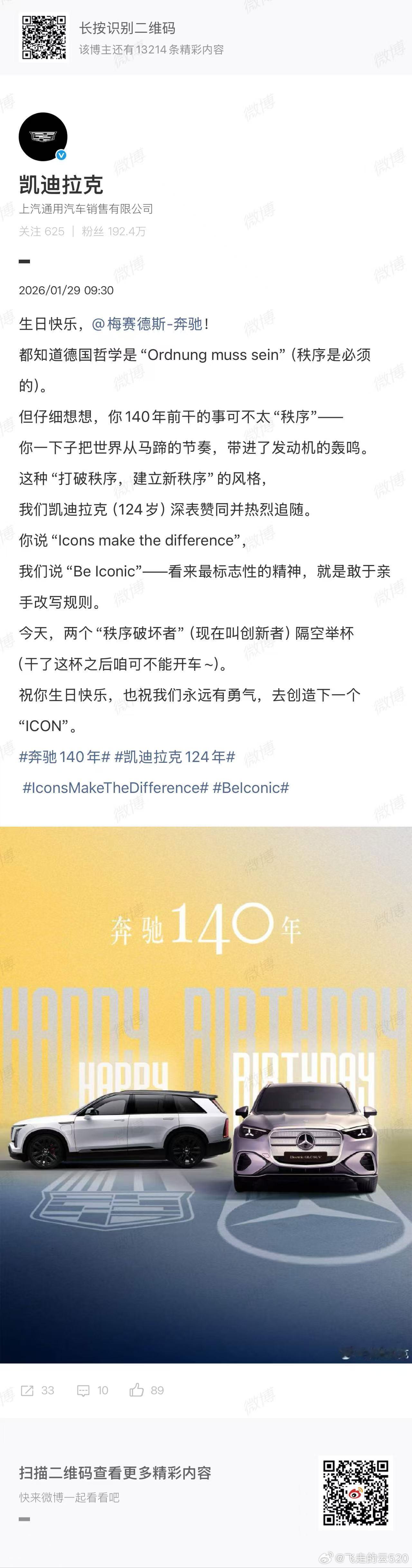 奔驰140年牛逼,凯迪拉克124年前来祝贺,格局到位了