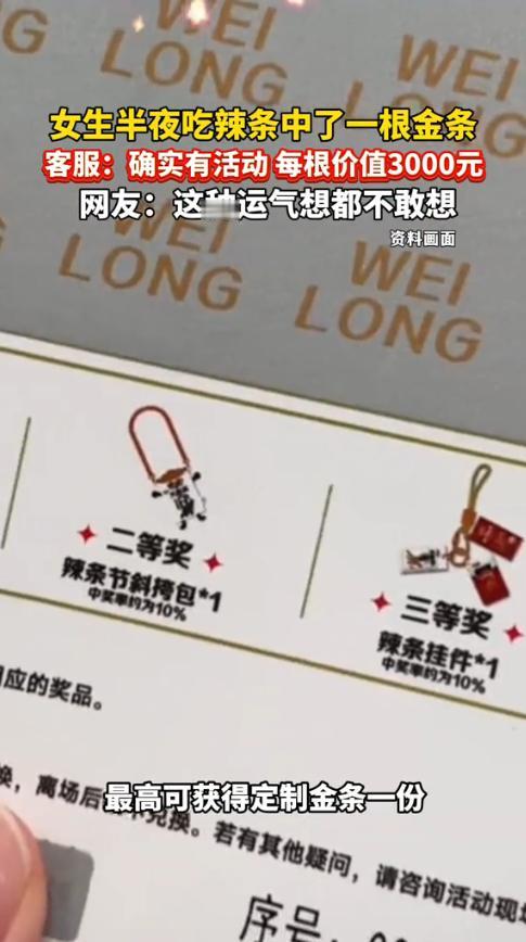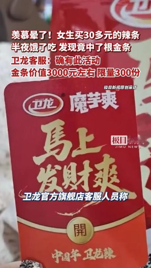 “简直赚翻了!”1月27日,四川绵阳,一女生半夜饿醒,随手拆了包辣条解馋,竟意外扫出1根金条大奖!起初她还以为是假的,联系客服后才确认是真的,价值3000元,还是限量300份的福利!网友:羡慕哭了,我吃辣条怎么只有再来一包! 现在不少零食品牌都会搞抽奖活动回馈顾客,但大多人买零食都是图个解馋,压根没指望能中大奖,像吃辣条中金条这种奇遇,属实是可遇不可求的幸运。 据媒体1月28日报道,半夜肚子饿得咕咕叫,便从零食堆里翻出了白天买的一辣条大礼包,拆开包装后,发现里面有一张抽奖卡片。她随手扫码参与,跳出“中金条”的提示时,第一反应竟是“这肯定是骗人的”,压根没放在心上。 直到第二天,她抱着试试看的心态联系了品牌客服,没想到客服当场确认:“是真的!这根金条价值3000元,我们一共就放了300份!”女生这才反应过来,自己真的中了大奖,激动得差点跳起来。 目前,杨女士已经按要求填好了收货地址,就等着这根幸运金条上门。网友看后纷纷酸了,有人调侃,别人吃辣条中金条,我吃辣条只长肉! 生活中的惊喜往往来得猝不及防,有时候随手的一个小举动,就能撞上意想不到的好运。毕竟谁又能想到,半夜吃包辣条,竟收获了价值3000元的金条呢! 信息来源:《羡慕晕了! 四川一女生半夜饿了起来吃辣条,发现竟然中了1根金条。卫龙客服:确有此活动,金条价值3000元左右,限量300份(原创内容)》极目新闻
