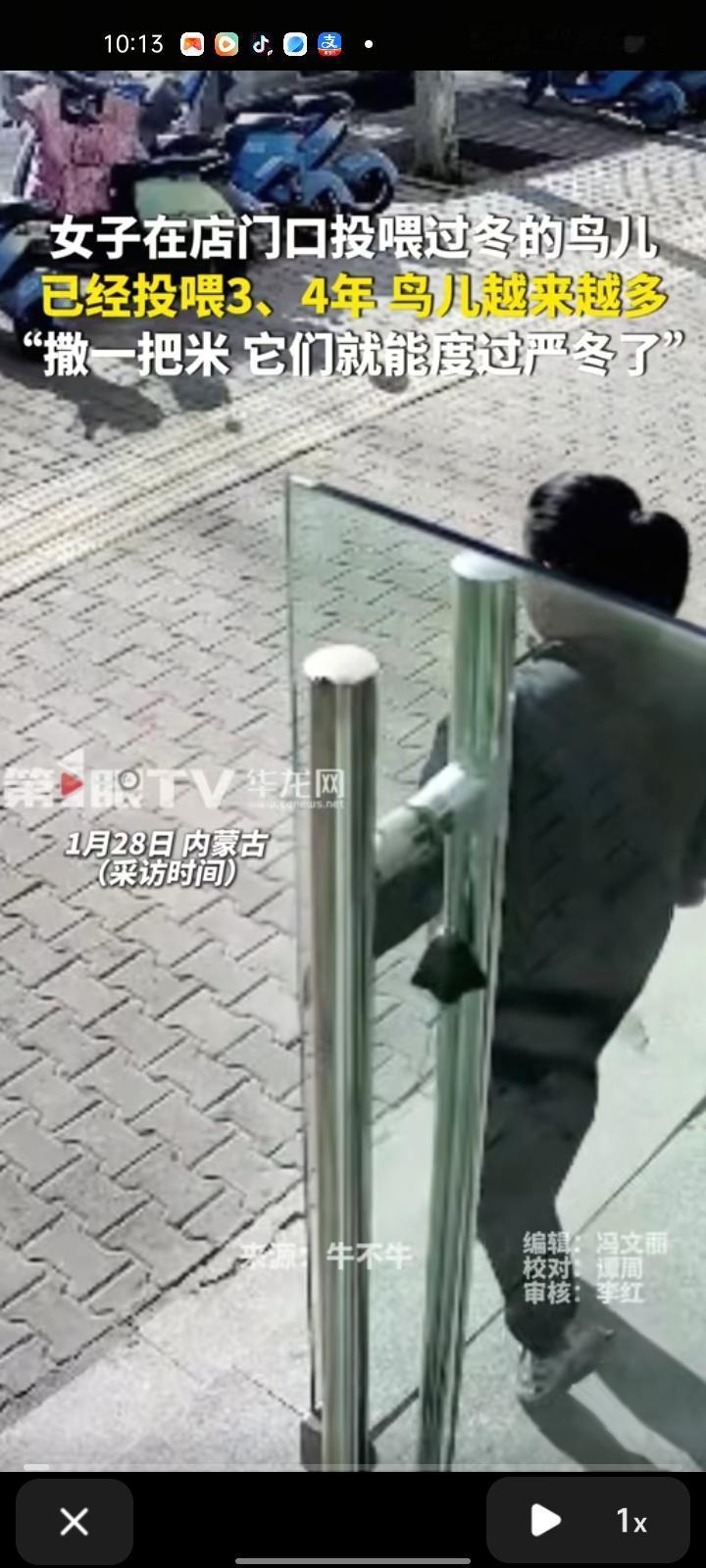 1月28日,内蒙古乌海。女子在店门口投喂过冬的鸟儿,已经投喂了三四年,一开始没那么多,冬天喂夏天不喂,毕竟鸟也是生命。她表示,冬天它们没什么吃的,撒一把米,它们就能度过这个严冬了。