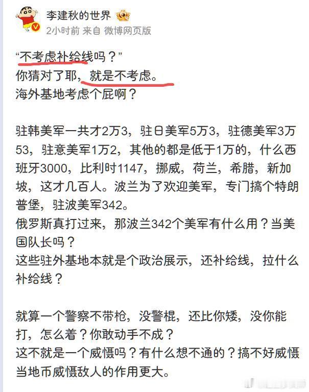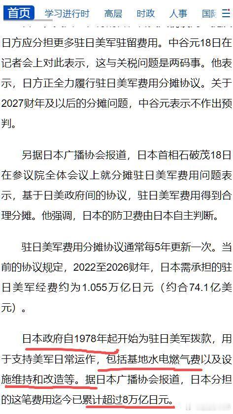 大V能不能别张口就来“美军海外基地不考虑补给线”?你哪怕用中文搜索引擎呢?美军的水电费都让日本出!📍美军有个叫美国运输司令部 (USTRANSCOM),可能翻译成美国军事运输司令部比较好。哪怕是中文网页都会告诉你:📍美军运输司令部共辖有战略重型运输机700余架,大型海运舰只400余艘,军用铁路车皮和专用站台3000个。这叫没有补给线?这种堪比民航巨头,海运巨头公司的运力是干什么的?📍至于美国的小弟是不是给海外美军基地掏钱?哪怕你看一看中文网页呢?比如《日防卫相:没理由改变驻日美军驻留费分摊协议》里面写道:日本政府自1978年起开始为驻日美军拨款,用于支持美军日常运作,包括基地水电燃气费以及设施维持和改造等。据日本广播协会报道,日本分担的这笔费用迄今已累计超过8万亿日元。可见没有?这钱掏得有多无微不至?