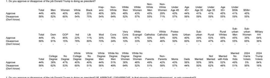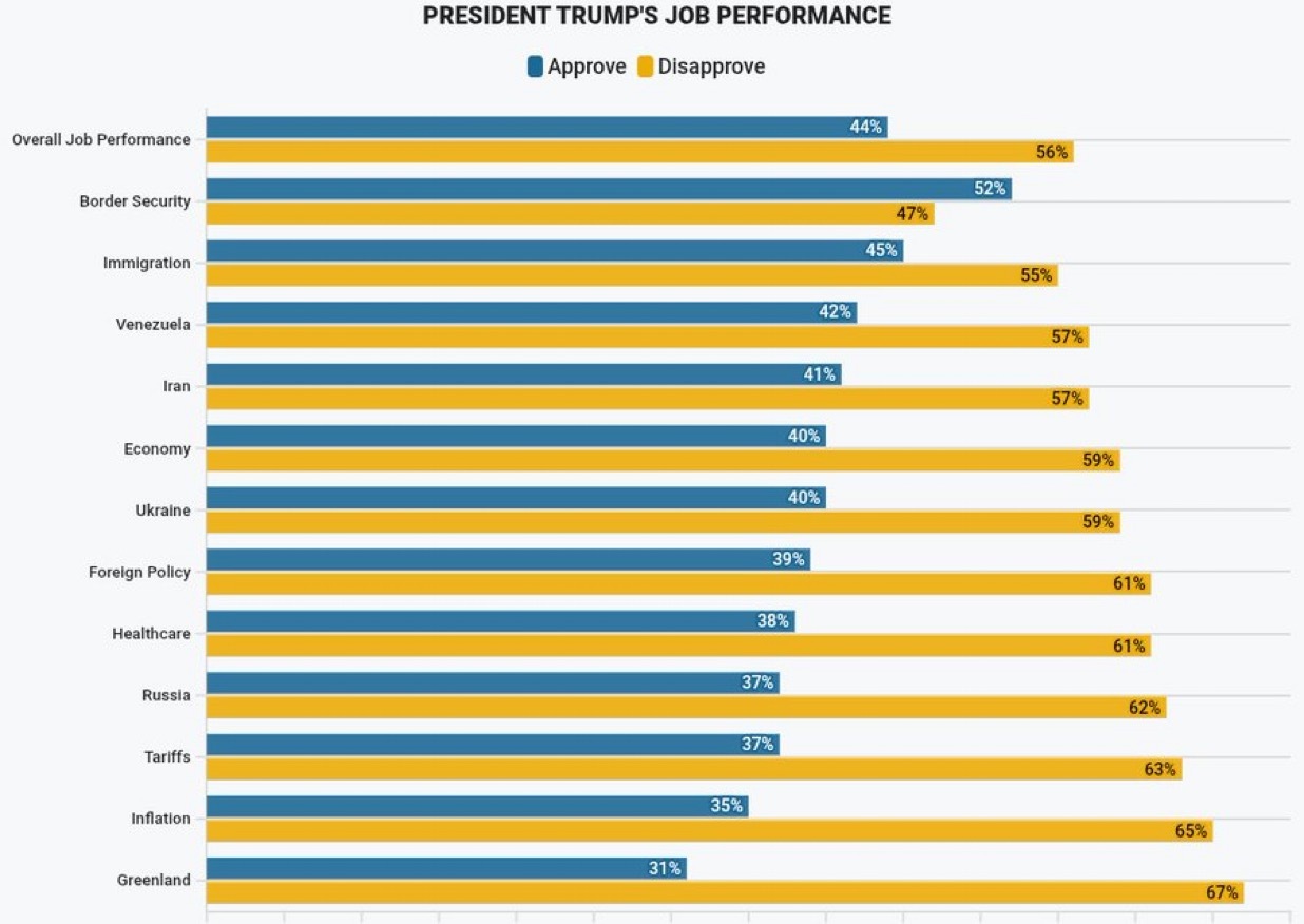 福克斯新闻全国民调,由偏共和党的Shaw和偏民主党的Beacon Resear两家民调机构联合完成,•1月23日至26日|1,005名登记选民|误差±3%。特朗普支持率。支持:44%(持平)不支持:56%(持平)特朗普关键议题上的净支持率🟢 边境安全:+5🟤 移民:-10🟤 委内瑞拉:-15🟤 伊朗:-16🟤 经济:-19🟤 乌克兰:-19🔴 外交政策:-22🔴 医疗保健:-23🔴 俄罗斯:-25🔴 关税:-26🔴 通胀:-30🔴 格陵兰(丹麦):-36各人群特朗普净支持率。🟢 MAGA支持者:+94🟢 共和党人:+70🟢 农村选民:+6🟤 无大学学历白人:-2🟤 男性:-4🟤 西班牙裔:-8🟤 白人:-8🔴 女性:-20🔴 郊区选民:-21🔴 黑人:-50🔴 独立选民:-56🔴 民主党人:-82为海外华人提供有价值的信息与分析,更多内容和全文可在蓝天、电报、x查找causmoney,或直接谷歌搜索caus.com