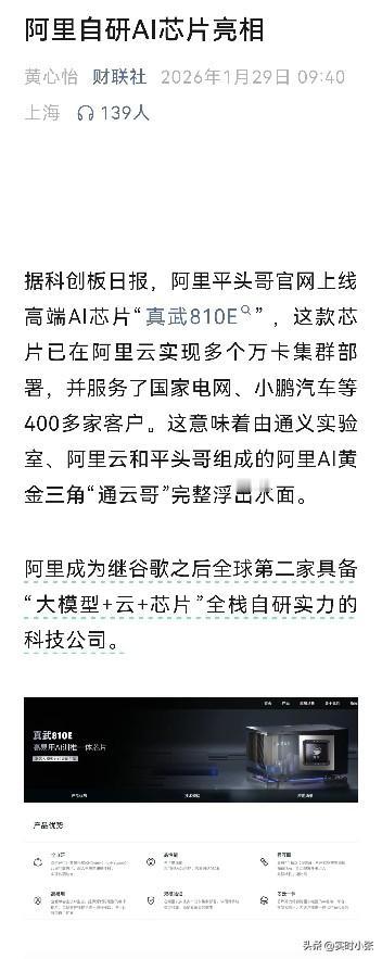 阿里平头哥自研AI芯片“真武810E”正式亮相!这款高端AI芯片已在阿里云实现万卡集群部署,服务国家电网、小鹏汽车等400+客户,标志着阿里“通义实验室+阿里云+平头哥”的AI“通云哥”黄金三角完整成型,也让阿里成为继谷歌后,全球第二家拥有“大模型+云+芯片”全栈自研能力的科技公司。从芯片设计到算力落地,阿里AI生态再添硬核底气,国产AI算力赛道再迎重磅突破!可以值得关注吗?