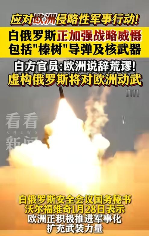 白俄罗斯彻底不藏了,白俄安全会议国务秘书沃尔福维奇公开放话,欧洲正一门心思搞军事化,疯狂扩军、大搞军演,白俄被逼到墙角只能祭出“榛树”导弹和战术核武器,全面加强战略威慑,这波反击直接把国际舆论炸翻了。 这事真不是白俄没事找事,最近欧洲的军事动作简直没底线,北约扎堆往波兰、波罗的海这些俄白边境国家增兵,一场接一场搞大规模军演,军费更是一路飙升,明摆着是在俄白家门口耀武扬威。 更离谱的是,西方还编出“俄罗斯要对欧洲动武”的瞎话,给自己的军事化扩张找遮羞布,在白俄眼里,这套说辞简直荒唐透顶! 然而白俄这次拿出来的“硬货”,个个都是压箱底的杀招,“榛树”导弹是俄制中程机动导弹,能搭载核弹头,射程能覆盖欧洲大部分区域。 早在2025年12月就已在白俄部署到位,随时能进入战斗值班。 而战术核武器,是俄白联盟框架下的联合威慑配置,由俄罗斯提供,相当于给白俄的安全加了双重保障。 不过白俄也多次强调,这些部署绝非主动挑衅,纯粹是防御性举措,目的就是震慑潜在的侵略,守住自己的国土安全。 其实白俄这波强硬操作,完全是被欧洲的军事化逼出来的无奈反击,地区安全本可以靠对话协商解决,可欧洲偏偏选择扩军对抗,把局势越搅越紧张,白俄不亮出硬实力根本无法自保。 说到底,欧洲与俄白的安全矛盾,根源就是缺乏有效沟通,欧洲一味扩军备战,白俄只能以威慑对威慑,长此以往只会陷入“越对抗越危险”的恶性循环。 想要真正化解地区危机,还是得放下对抗姿态,重回谈判桌,毕竟和平才是硬道理,军事对抗从来都不是解决问题的出路!