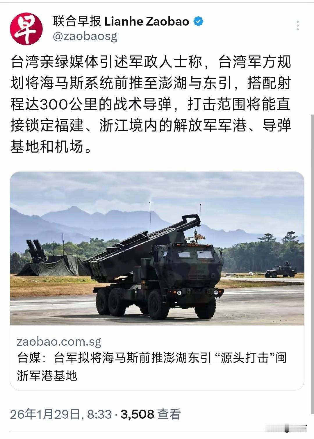 台独分子越疯狂,离统一就越近!台独分子要把海马斯前推到澎湖、东引,澎湖离福建只有140公里,东引岛更是贴在闽江口边上。大陆这边早就笑着等着这一刻——不是等威慑,是等收快递,等这些主动送上门的活靶子。 把海马斯这种暴露在解放军火力全覆盖下的装备摆到前沿,等于给解放军的东风导弹、远火系统递上了精准坐标。别说“打击大陆基地”,这些装备刚部署到位,可能还没来得及开机,就会被首轮火力彻底摧毁。海马斯在乌克兰都被俄军揍得满地找牙,到了台海这种“解放军主场”,连10分钟的生存时间都撑不住。 台军把进攻性武器摆到前沿,等于把坐标直接送过来。解放军的侦察体系早就把澎湖、东引的地形、电磁信号摸得一清二楚,海马斯刚部署,就成了点名清单上的头号目标。 台军主动突破两岸红线,把进攻性武器前推到离大陆百公里的位置,等于给解放军的反制送上合法理由。从反制挑衅到自卫反击,法理上完全站得住脚,舆论上更是占据主动。 美国一直把台湾当耗材,现在逼台独把最值钱的装备摆到前沿,就是要看美国敢不敢真的下场。如果美国躲在背后装哑巴,岛内民众只会彻底看清美国靠不住;如果美国敢介入,正好给了解放军打狗给主人看的机会。 说到底,台独分子把海马斯推到澎湖,不是以武谋独,是自掘坟墓。大陆等的就是他们彻底触碰红线的这一刻!到时候,不仅海马斯会变成废铁,整个台军的军事体系都会被清零,统一的进程只会比预想的更快。