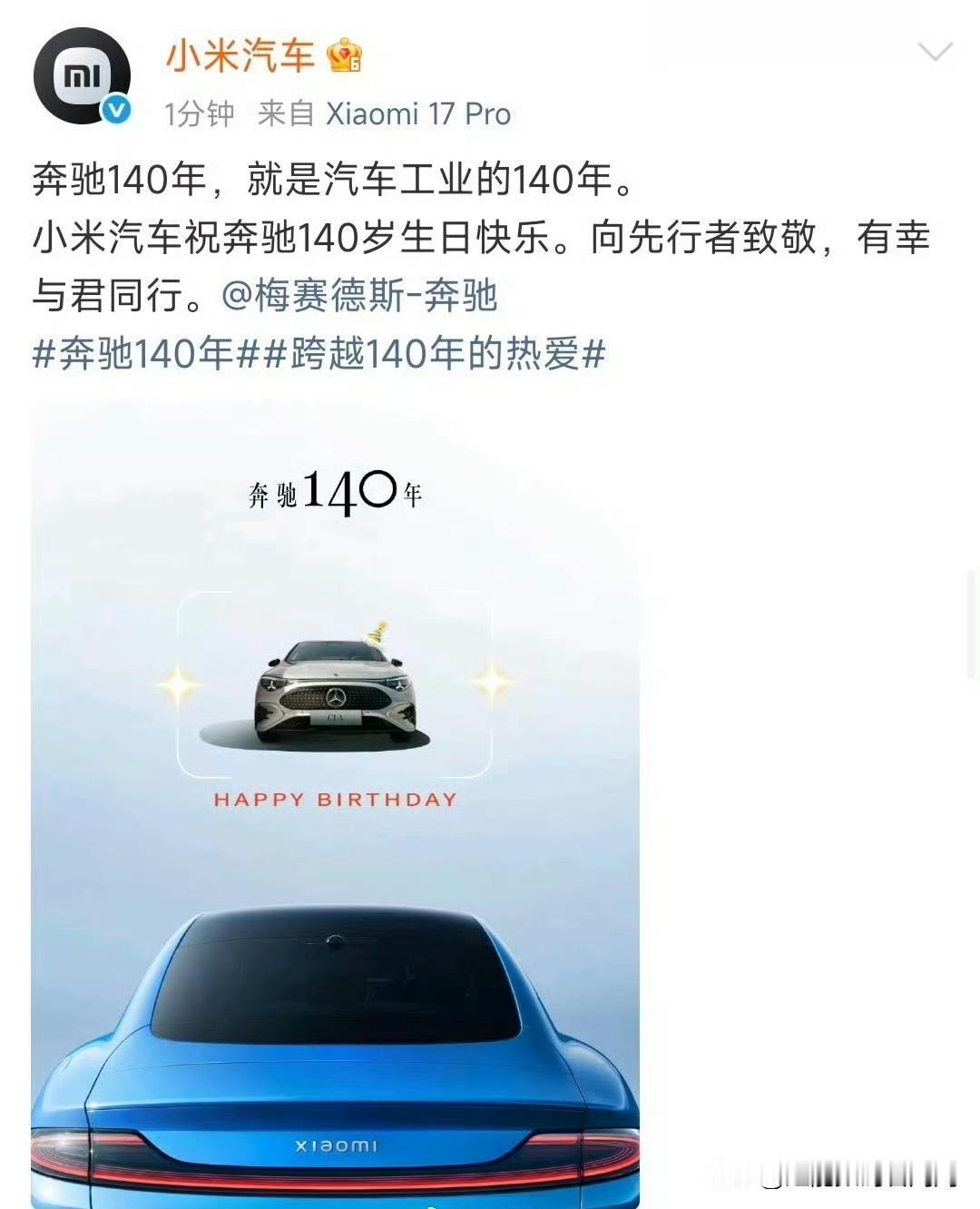 如果你是奔驰汽车,面对小米汽车官方发来的深情致敬(内容如下):“奔驰140年,就是汽车工业的140年。 小米汽车祝奔驰140岁生日快乐。向先行者致敬,有幸与君同行。”你会怎么应对?如果不回应,那么就会显得自己很没格局;但是如果回应了,那么也就意味着将赠送泼天的流量给到对方。“140年汽车工业”一词并不陌生,此前就高频出现了在了汽车发布会上……