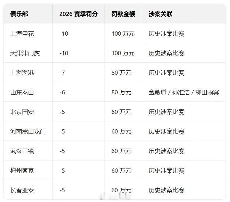这个表不知道准不准,海港也得罚5分中国足协九家中超俱乐部被罚 深圳