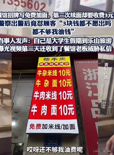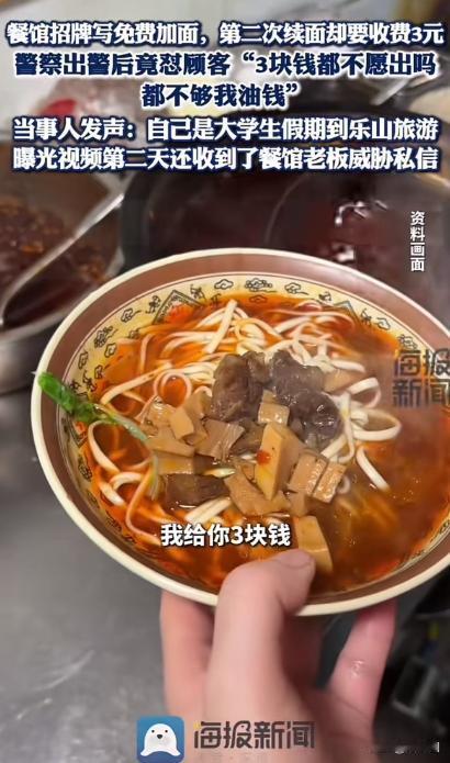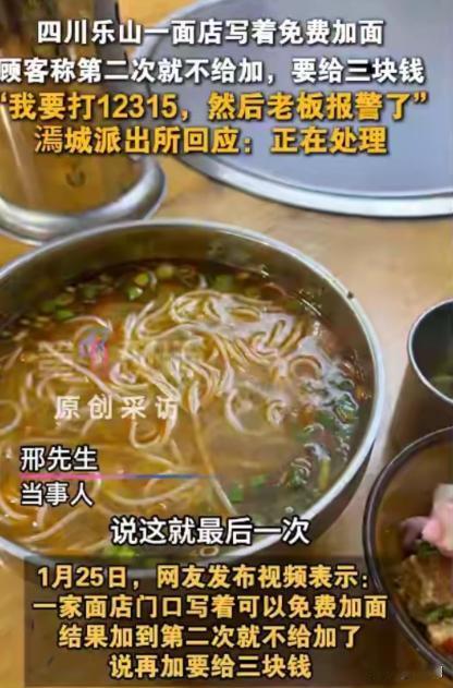 “乐山摊上大事了!”大学生去吃面,面馆招牌写免费加面,可他第二次续面却要收费3元!大学生不服,可民警来了以后,居然帮着老板怼大学生:“你3块钱都不愿出吗?这点钱还不够我开到这里的油费!” 1月的济南,天寒地冻,但市区的一家小面馆里却热气腾腾。小邢,一名刚进入大学不久的学生,下课后便走进这家面馆,准备点一碗面暖暖身子。 门口的招牌很醒目:“免费加面”,小邢看着这几个大字心里暗自高兴:“不错,学生党福利,这下可以吃饱了。” 他点了一碗红烧牛肉面,吃得津津有味。 面快吃完时,小邢觉得还不够饱,于是走到柜台前小声问老板:“能再加一份面吗?我看到招牌写免费加面。”老板愣了一下,随后露出一抹不耐烦:“加可以,加面3块钱。” 小邢愣住了,他指着招牌说道:“老板,你看你牌子上写的——免费加面,我第二次续面为什么还要收费?” 老板的眉头一皱,声音也提高了:“牌子上写的是‘免费加面’,不是无限免费,你第一次加面免费,第二次就得收费,这是常理。” 小邢不服,心里越发气愤:“常理?你招牌写得那么明明白白,顾客怎么能理解成只限一次?我可是按照你们宣传来的!” 两人的争执越来越激烈,周围顾客投来了好奇甚至略带厌烦的目光。 老板突然伸手,一把夺走小邢的空碗,冷冷说道:“不吃了就走人!”小邢顿时傻眼,碗里的汤还剩一半没喝完,却被无情地抢走。 气愤之余,小邢掏出手机,拨通了12345市民服务热线:“我在面馆遇到消费欺诈!他们招牌写免费加面,可第二次就要收钱,还把我的碗抢走了!” 没想到几分钟后,面馆老板情绪激动地报了警:“有人闹事!” 当民警赶到现场时,小邢以为自己有理必胜,想要维护权益,然而民警的一句话让他傻眼:“你3块钱都不愿意出吗?这点钱还不够我开到这里的油费!” 小邢心里一凉,原本以为报警能帮自己讨回公道,结果却像是倒打一耙。 面馆里,空气中弥漫着一股紧张气息。老板冷哼一声,拍了拍柜台,“影响生意的人,咱们不欢迎。”小邢气愤之下,回到宿舍,将整件事情写成长帖发到了微博和本地论坛上。 帖子一发,引起了网友热议。有些人站在小邢这边:“明明招牌写免费加面,却偷偷收费,这就是典型的文字陷阱!”“老板的态度也太蛮横了,把顾客的碗抢走,这算什么服务?” 也有人表示理解老板:“3块钱就闹成这样?学生也别太计较了。”还有不少本地网友围观后,留言中带着地域偏见:“这种小事都要上网告状,吃不起就别出来丢人。” 然而,支持小邢的评论更引人关注:“这不仅仅是3块钱的问题,而是诚信问题。招牌就是广告,你随便改规则,那不是坑顾客吗?” “如果每个商家都这样,谁还敢信招牌?消费者权益呢?” 帖子在短短几小时内被转发上万次,许多网友还附上自己的经历:有人在咖啡店遇到宣传折扣,但结账时被告知“仅限工作日”; 有人在火锅店看到“免费饮料无限续杯”,结果第二次被服务员阻止……讨论的热度迅速升级,形成了一场关于商家诚信、广告宣传、消费者权益的舆论风暴。 面对舆论压力,面馆老板在视频里表态:“有人散布谣言,影响生意,我也会采取法律手段。”视频语气带着威胁,却引来更多网友不满:“用法律威胁消费者?这才是问题所在。” 小邢在网络上持续更新情况,同时也向12345再次提交投诉,并联系了本地消费者协会。协会工作人员表示,会介入调解,并提醒商家宣传应清晰明确,不得误导消费者。 事情发酵开来,不仅引发了校园和市民的关注,也让本地媒体注意到此事件。 一些新闻号发布报道,标题直指“免费加面变收费,大学生维权遭冷漠”。 评论区炸开了锅,讨论最热的话题包括:商家广告是否存在误导?消费者如何保护权益?执法部门是否存在偏袒商家的现象? 与此同时,网友们的讨论也带有幽默感:“如果你招牌写‘免费加面’,我加五次你要收我五次钱吗?”“老板抢碗的操作,我觉得可以上综艺了。”