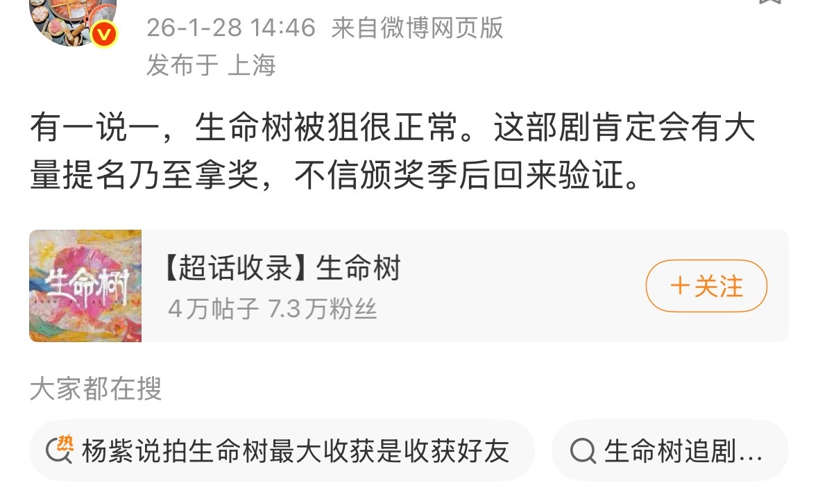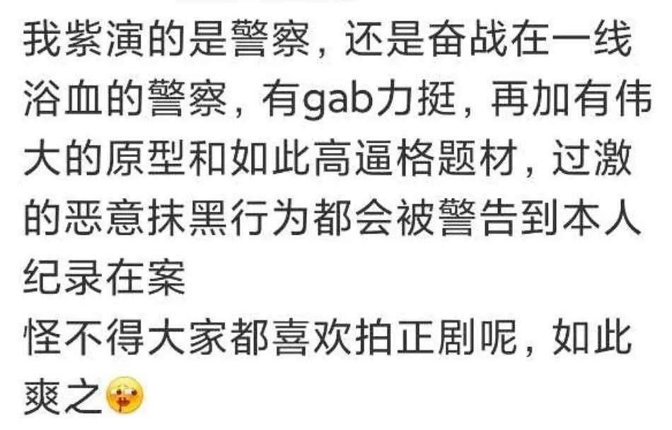 从没见过提前捂嘴观众这么厉害的剧生命树还没开播就开始造势冲奖,已经完全不需要观众了。刑侦101大大小小的流量基本都演了个遍,也没见其他人拿角色职业恐吓观众的,真过分傲慢了……