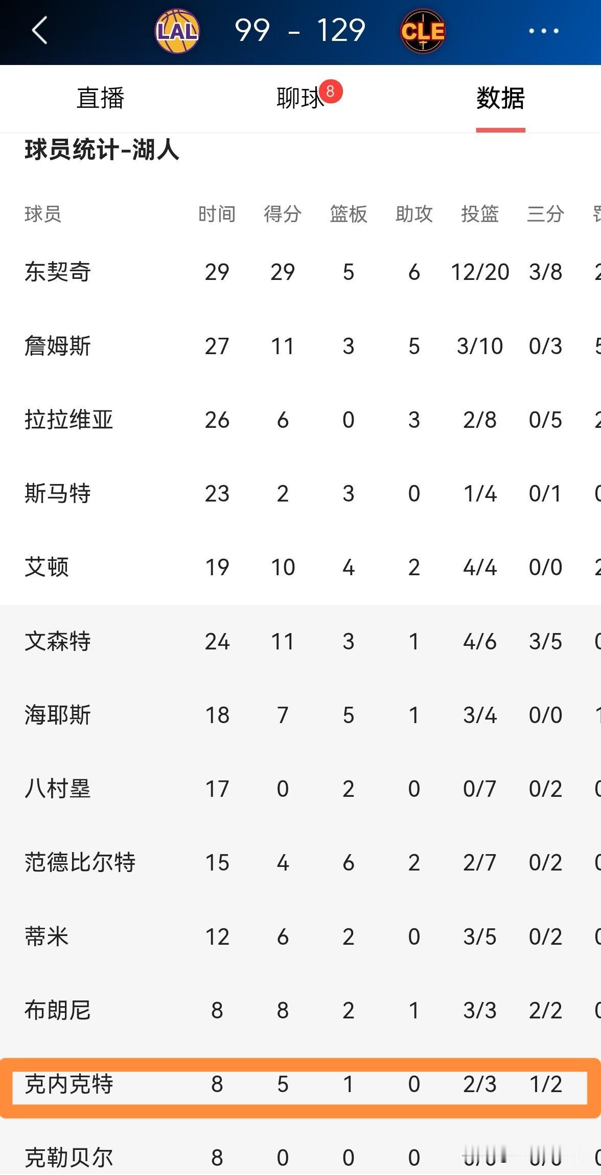 我强烈建议湖人留下小将克内克特!在今天湖人客场以99:129惨败于骑士的比赛中,克内克特替补出战8分钟,投篮3中2,其中三分球2中1非常高效的得到5分,还有1篮板,没有出现任何的失误,他的场上正负值为-1。 实事求是的说,以克内克特展现出来的投射能力来看,只要湖人愿意给克内克特稳定的上场时间,那么克内克特一定会在进攻端为球队提供非常大的帮助。毫不夸张的说,在投篮天赋方面,克内克特肯定比拉拉维亚、八村塁、范德比尔特强。