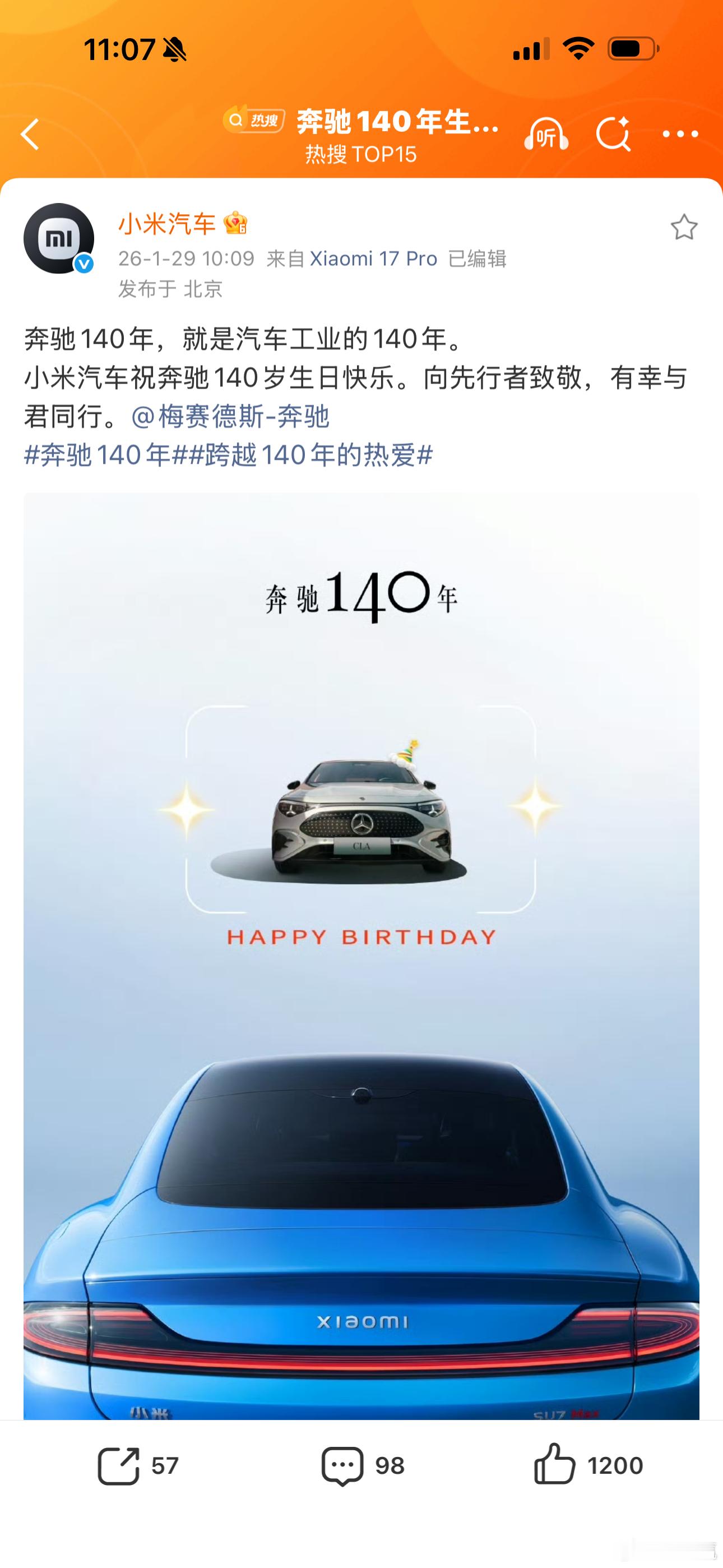 奔驰140年生日快乐各家车企给奔驰的生日祝福,感觉小米的最有诚意。