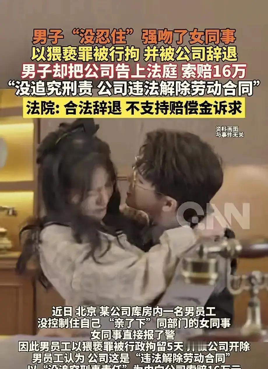 事发在公司库房,监控记录下全过程: 男员工朱某在与女同事独处时,突然上前强行亲吻,整个动作不到1分钟,却直接触及《刑法》中猥亵相关条款。 事后女方报警,朱某因涉嫌猥亵被行政拘留,期限以警方通报为准,但“被拘留”本身已写进处罚决定。 公司随即启动内部调查,在掌握视频、同事证言等多项证据后,依据员工守则作出解除劳动合同决定。 被辞退后,朱某并未选择和解或公开道歉,反而以“未被追究刑事责任”为理由,向公司主张约16万元赔偿。 他援引的是劳动争议中常见的“违法解除”条款,认为公司处理超出了规章制度的边界。 从公司角度看,一边是库房监控这一项关键证据,一边是性骚扰零容忍的管理要求,两者叠加,很难不做出解雇决定。 而在劳动仲裁或诉讼里,如何认定“情节”“证据”“比例性”,又往往要结合多方材料逐一审查。 当事双方都各自拿着法规条文、视频证据、单位制度来支撑说法,这类案件的裁量空间究竟有多大? 在你所在的行业里,类似情形下,公司和个人各该承担到什么“度”,才算对所有人都相对公平?