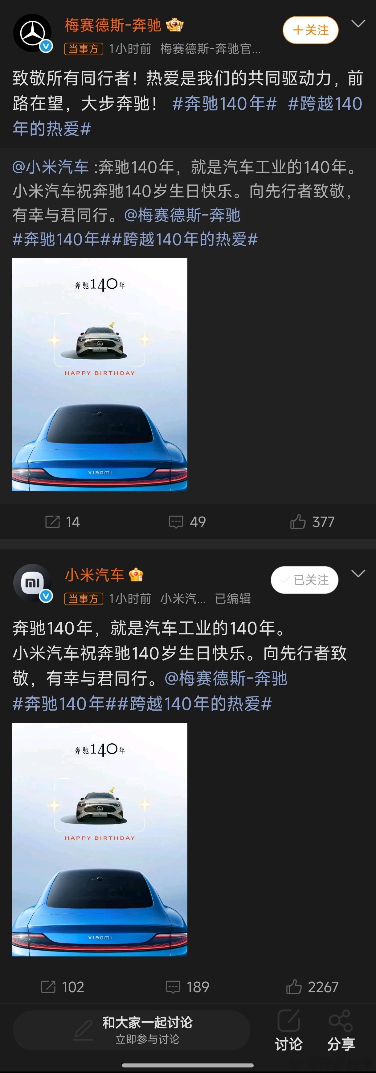 小米汽车向奔驰致敬奔驰回应小米汽车祝福 奔驰: 汽车发明者,过去140年历史的见证者小米: 生态缔造者,未来140年剧本的撰写者
