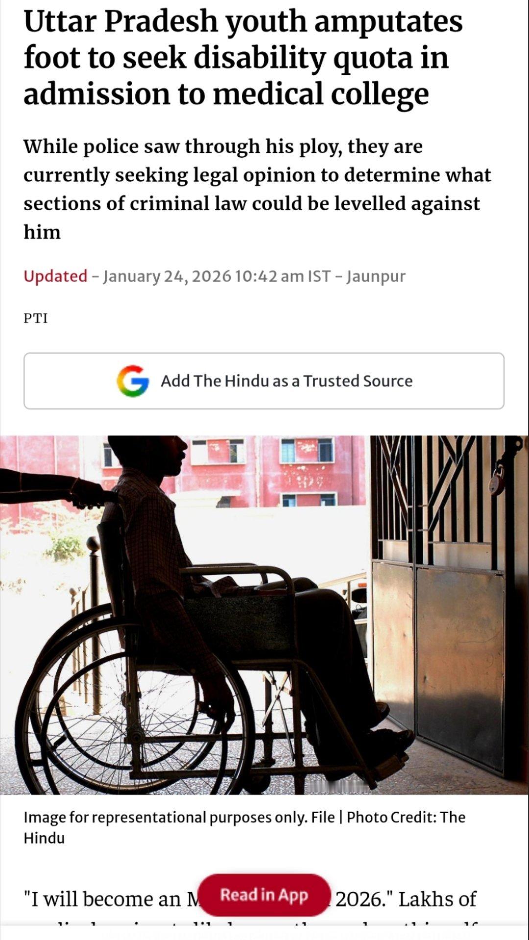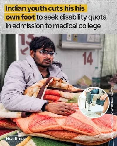 印度男子为上医学院砍断一只脚¹ 印度人把上医学院当成重要出路,满世界寻找医学院留学机会。² 这个印度人倒霉了。两次考试没考上,为了争夺残疾人佩额,谎称被袭击断脚。现在不但医学院上不成,还要被刑事起诉。涉嫌诈骗。³ 图2:这哥们这辈子恐怕彻底不好过了。热点科普
