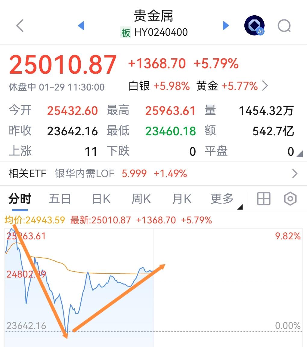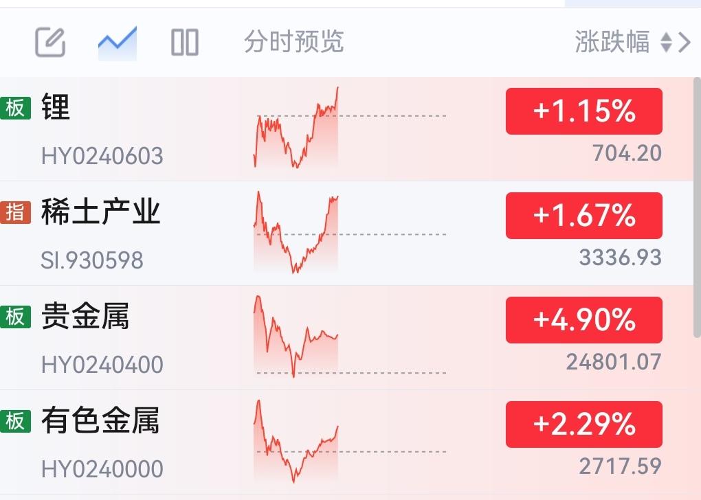 A股有色金属板块深V反弹,这一波猛烈的清洗应该有不少人被洗出去了吧! 今天早上A股开盘贵金属板块与有色金属板块就直线拉升,贵金属板块一度涨近10%、有色金属一度涨近5%。 随后两板块就是一波大幅度跳水,贵金属从+10%到-0.6%、有色金属从+4.5%到-2.6%,跌得是真的很猛啊!可能在这一波下跌应该让有很多朋友觉得行情可能结束了,而选择了获利了结、卖出离场吧! 可是哪里能想到主力资金这里只是虚晃一枪,大幅压盘只是为了想要更多的筹码; 目前看来主力资金的目的应该是达到了,拿到了不少筹码之后就立马开始了拉升。。 截止目前贵金属深V反弹,涨幅回到了+6%左右、有色金属深V反弹,涨幅回到了3%左右,看走势趋势大概率下午还会有持续性的拉升,涨幅再次回到早盘高点也不是不可能。 这一波洗盘洗得的确是狠,估计在下跌途中选择离场的朋友们此时此刻已经在拍大腿了。 也是没有办法,不得不承认我们小散的确是玩不过主力机构啊! 手段层出不穷、防不胜防。