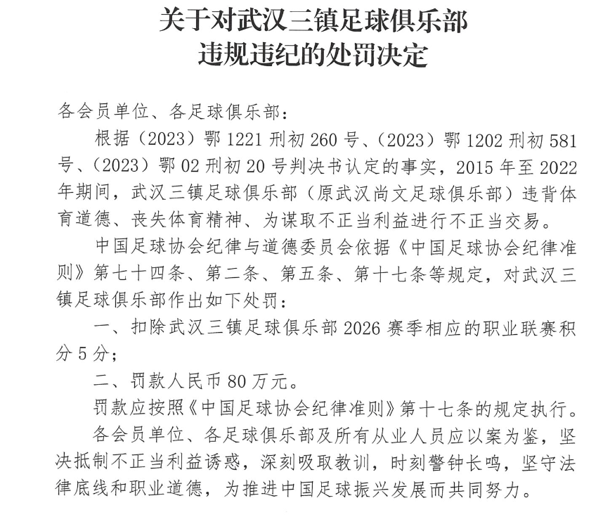 一、扣除武汉三镇足球俱乐部2026赛季相应的职业联赛积分5分;