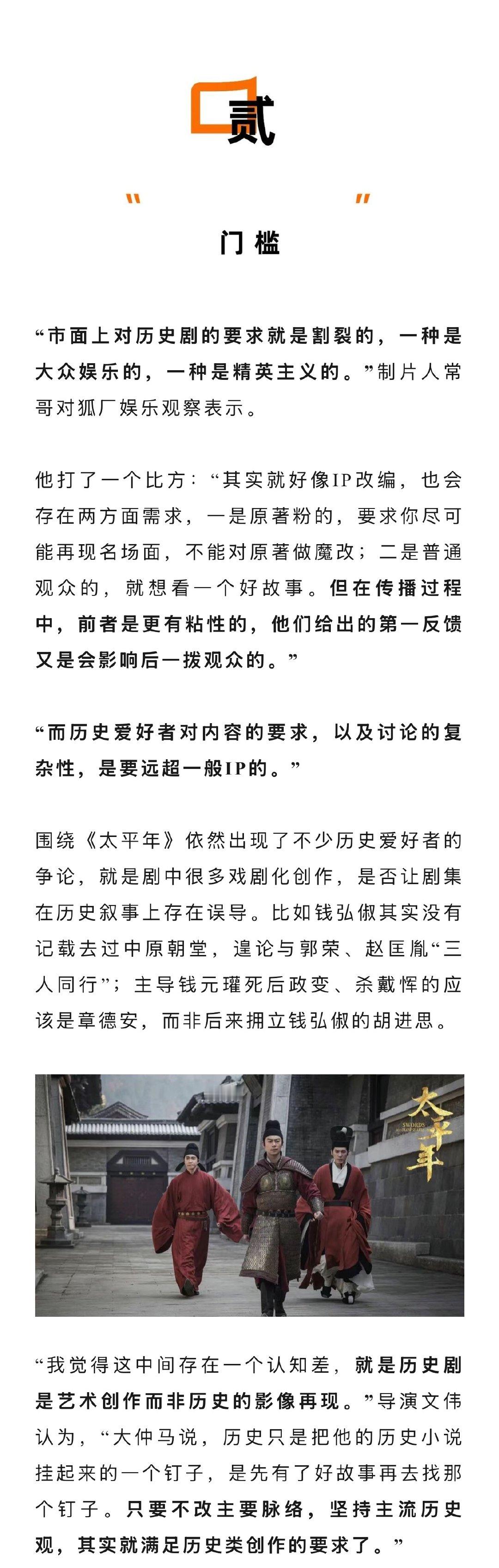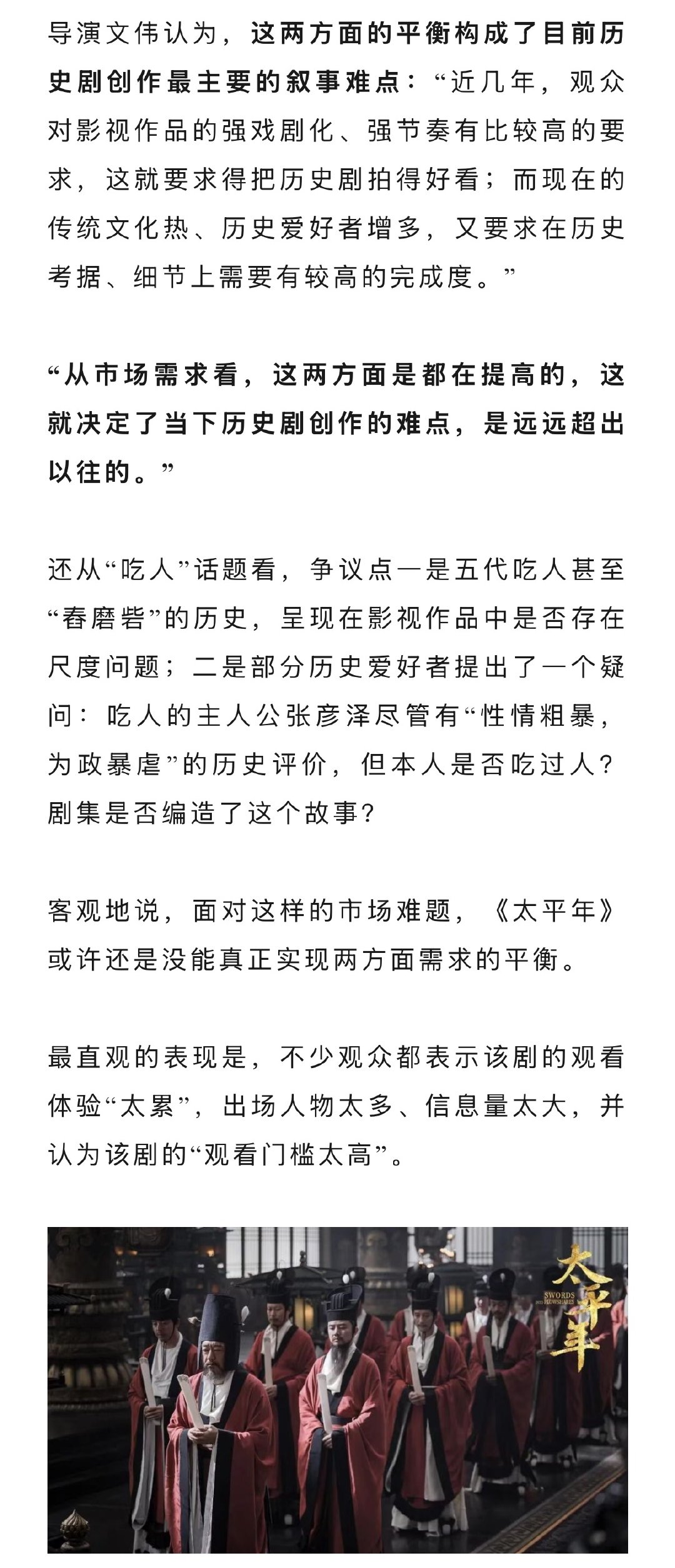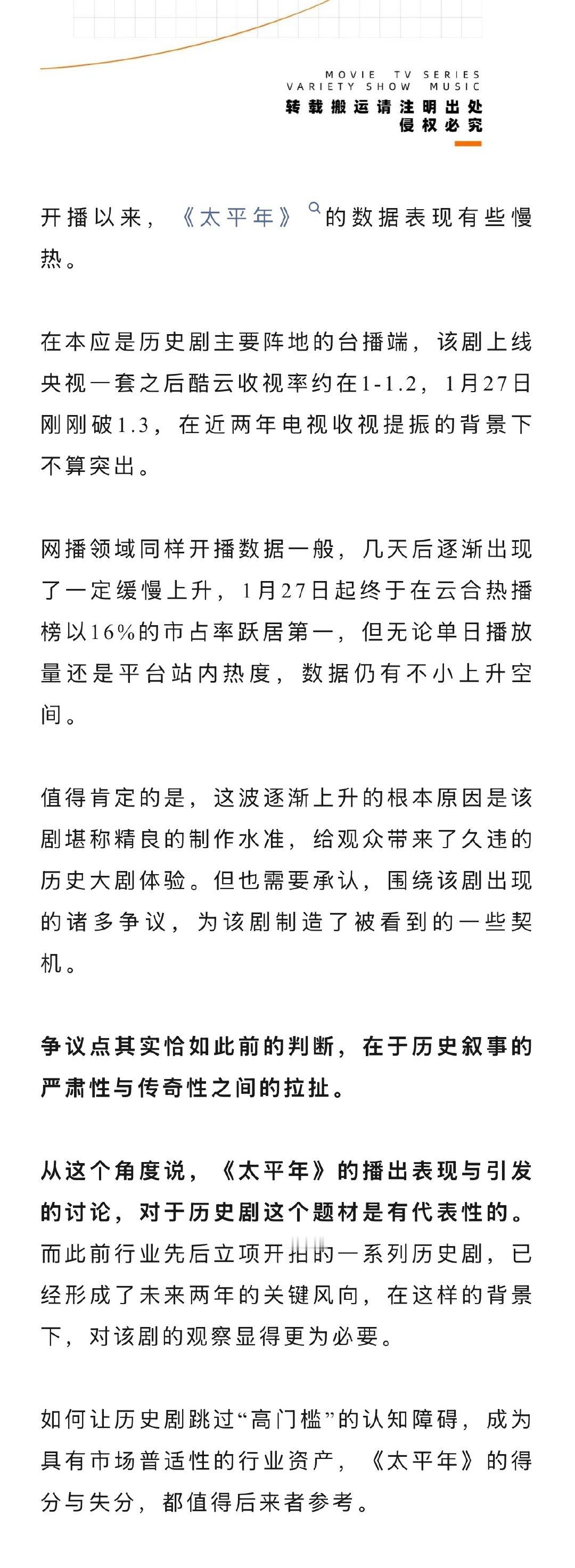 开播以来,《太平年》的数据表现有些慢热。但也需要承认,围绕该剧出现的诸多争议,为该剧制造了被看到的一些契机。争议点其实恰如此前的判断,在于历史叙事的严肃性与传奇性之间的拉扯。如何让历史剧跳过“高门槛”的认知障碍,成为具有市场普适性的行业资产,《太平年》的得分与失分,都值得后来者参考。