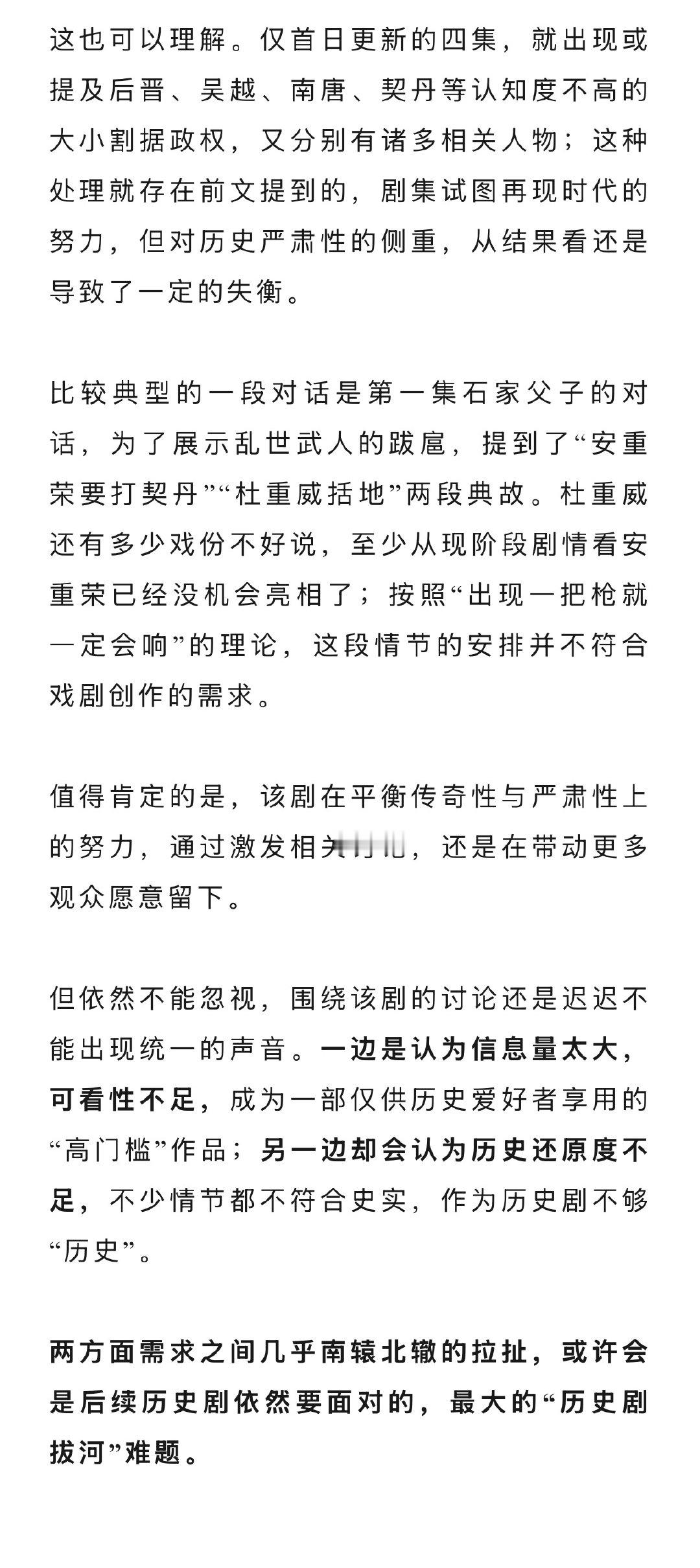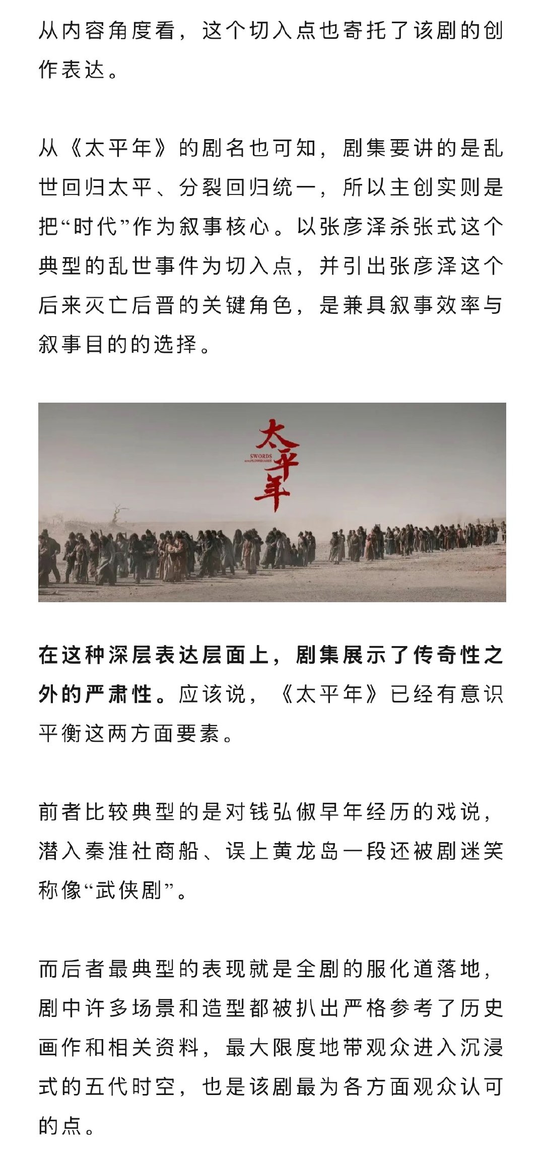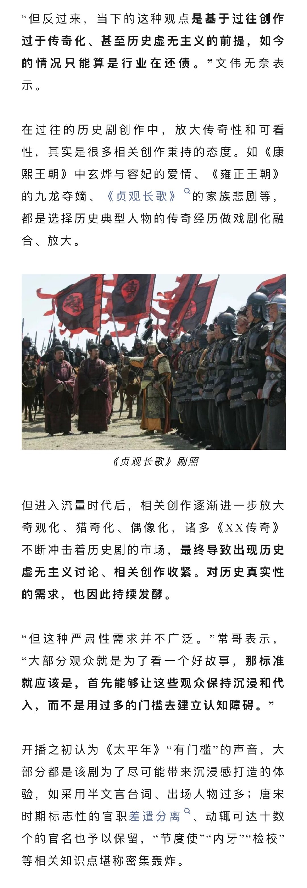 开播以来,《太平年》的数据表现有些慢热。但也需要承认,围绕该剧出现的诸多争议,为该剧制造了被看到的一些契机。争议点其实恰如此前的判断,在于历史叙事的严肃性与传奇性之间的拉扯。如何让历史剧跳过“高门槛”的认知障碍,成为具有市场普适性的行业资产,《太平年》的得分与失分,都值得后来者参考。