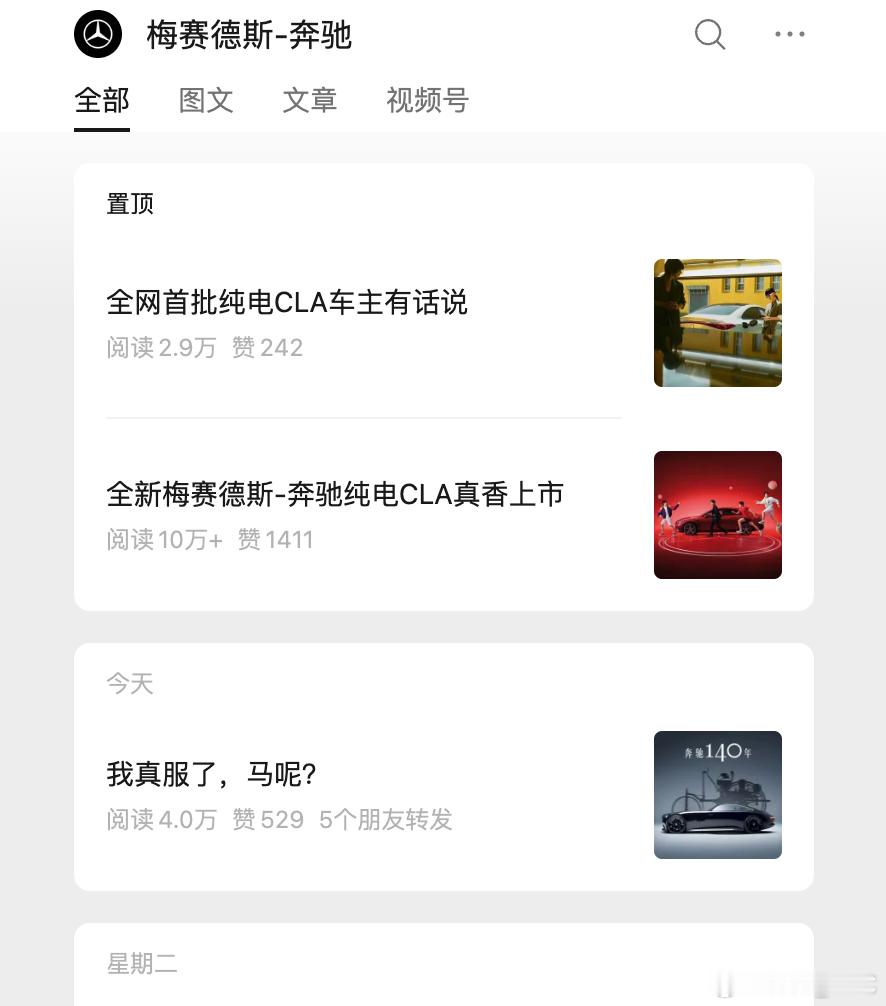 奔驰公众号今天标题有点东西.....「我真服了,马呢?」是也让00后接管了么评论区很经典:「马在宝那里呢」哈哈哈奔驰140年跨越140年的热爱