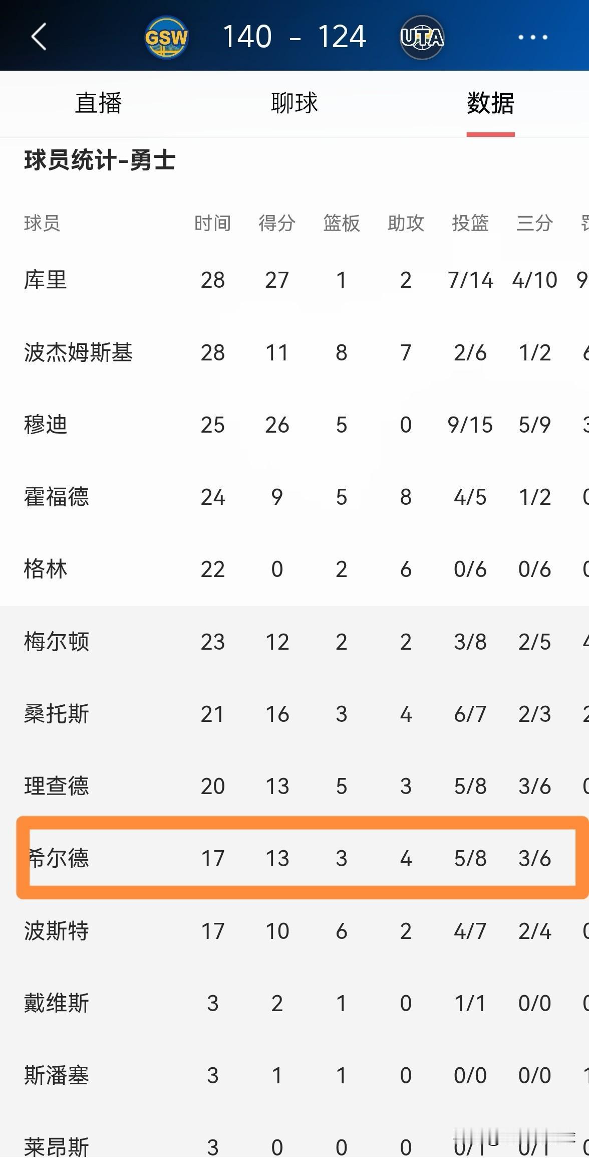勇士神射手希尔德终于证明自己了!在今天勇士客场以140:124击败爵士的比赛中,希尔德终于找回了久违的投篮手感,他在替补出战的17分钟里,投篮8中5,其中三分球6中3非常高效的得到13分,外加3篮板4助攻,仅有1次失误。 事实证明,希尔德的投射能力还是非常出色的,他只是由于心理素质不强导致投篮稳定性不高。