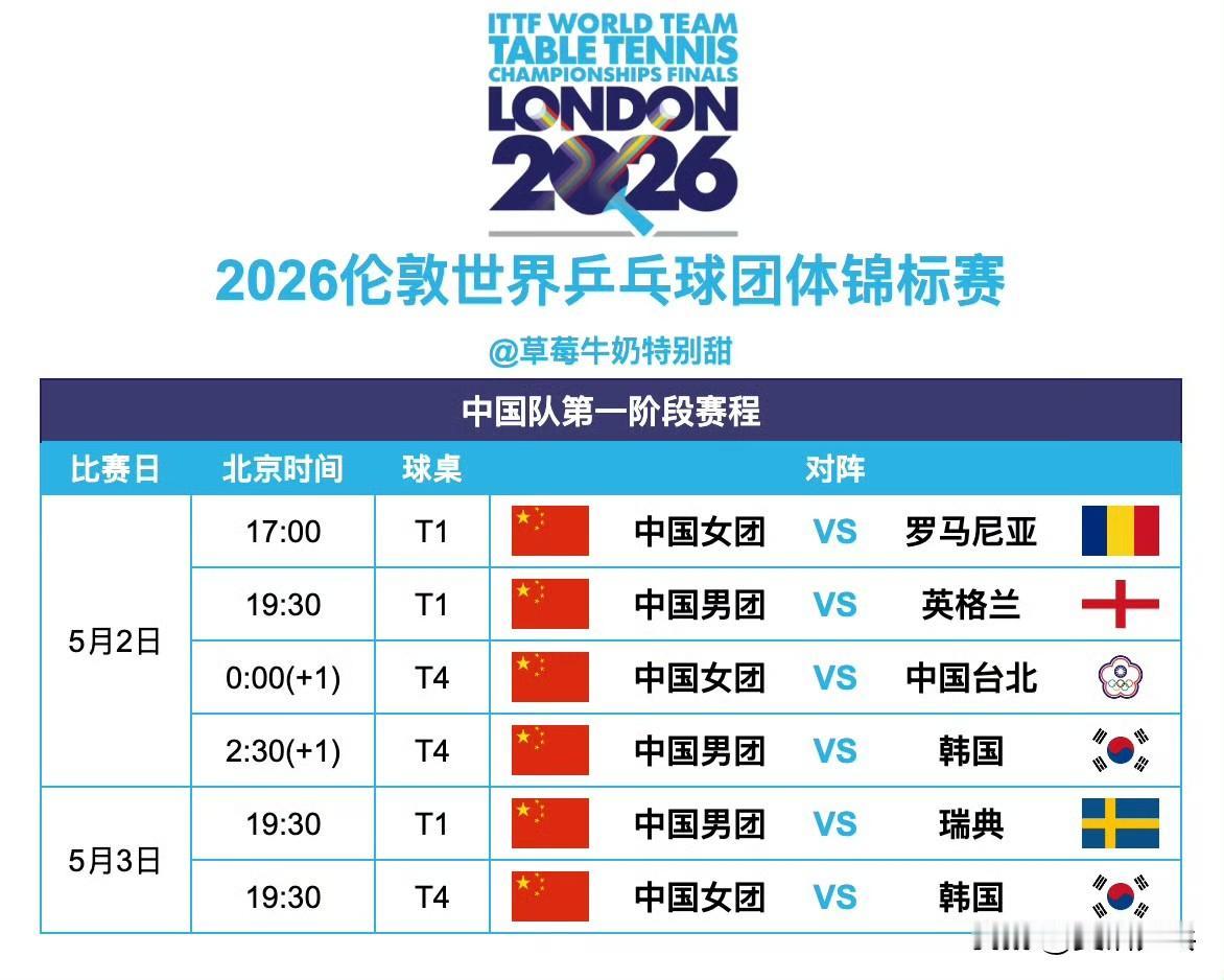 2026伦敦世界乒乓球团体锦标赛丨中国队第一阶段赛程 5月2日丨17:00 T1 🇨🇳中国女团🆚罗马尼亚🇷🇴 5月2日丨19:30 T1 🇨🇳中国男团🆚英格兰🏴 5月2日丨0:00(+1) T4 🇨🇳中国女团🆚中国台北 5月2日丨2:30(+1) T4 🇨🇳中国男团🆚韩国🇰🇷 5月3日丨19:30 T1 🇨🇳中国男团🆚瑞典🇸🇪 5月3日丨19:30 T4 🇨🇳中国女团🆚韩国🇰🇷