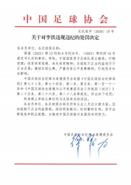 直播吧1月29日讯足协发布“假赌黑”整治处罚结果,中国国家男子足球队原主教练李铁因行贿受贿、操控足球比赛,终身禁止李铁从事任何与足球有关的活动。