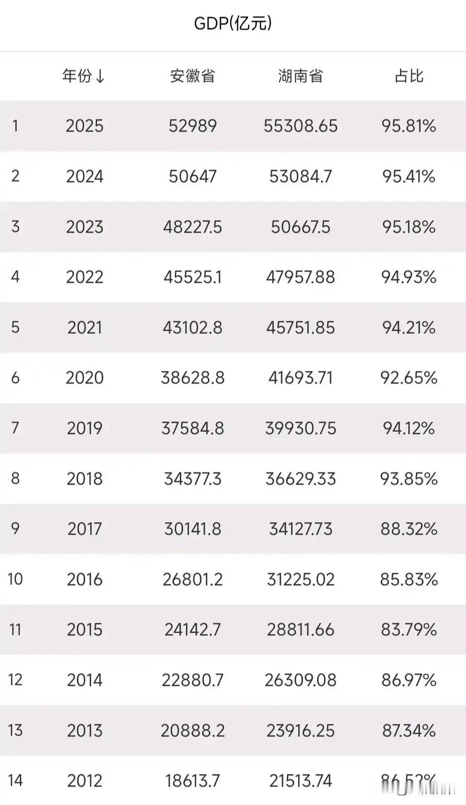 安徽GDP还有几年可以超过湖南? 其实,这个大趋势是人尽皆知。因为安徽在主要经济数据上,已经全面领先湖南,尤其是外贸、工业、地财三个领域,领先湖南太多了。 安徽GDP总量与湖南的差距,从2011年到2025年,只有4%的差距了,安徽增速每年都高于湖南,如果不是经济普查年,安徽两三年可以超湖南。如果是经济普查年,安徽或许立马可以超过湖南了。安徽经济排名 安徽GDP 安徽经济实力 安徽发展现状 安徽人均收入
