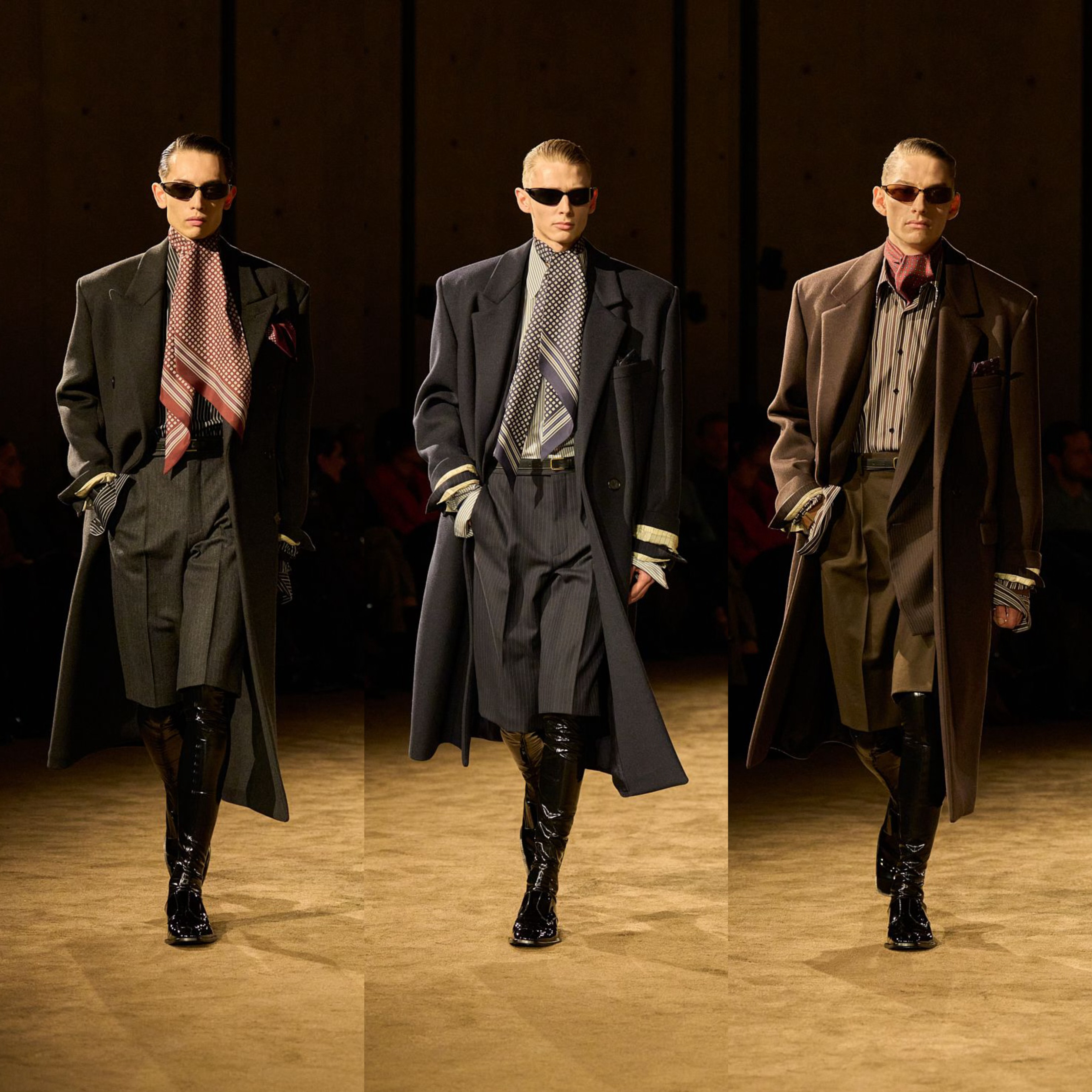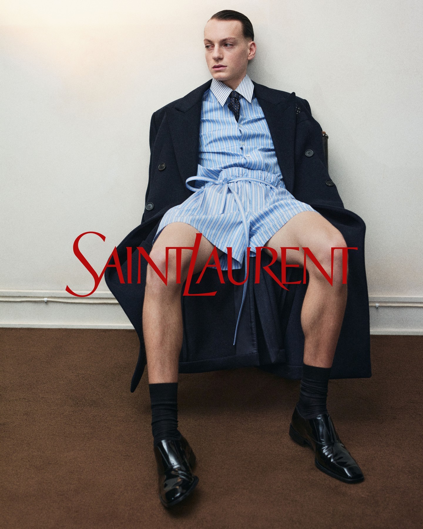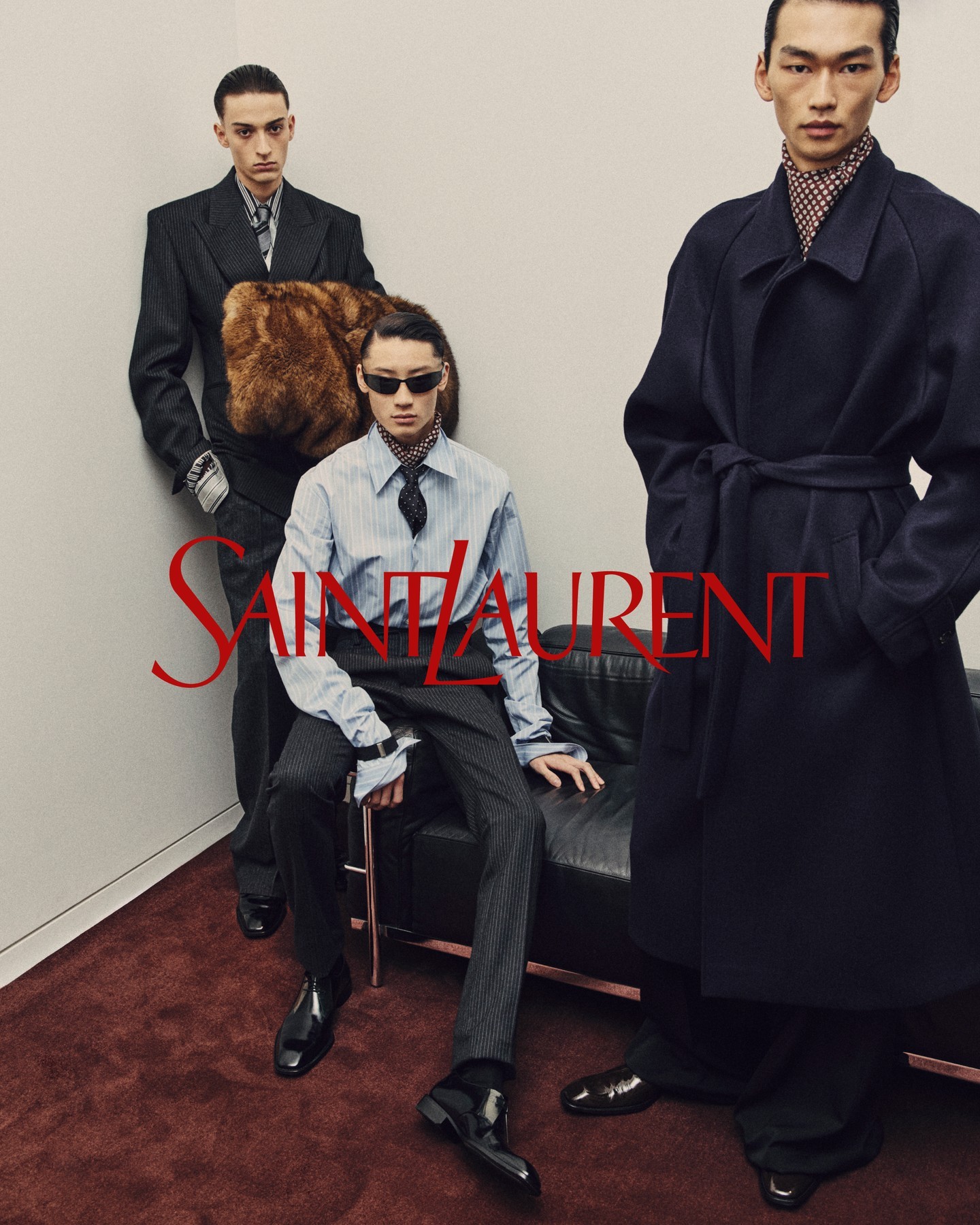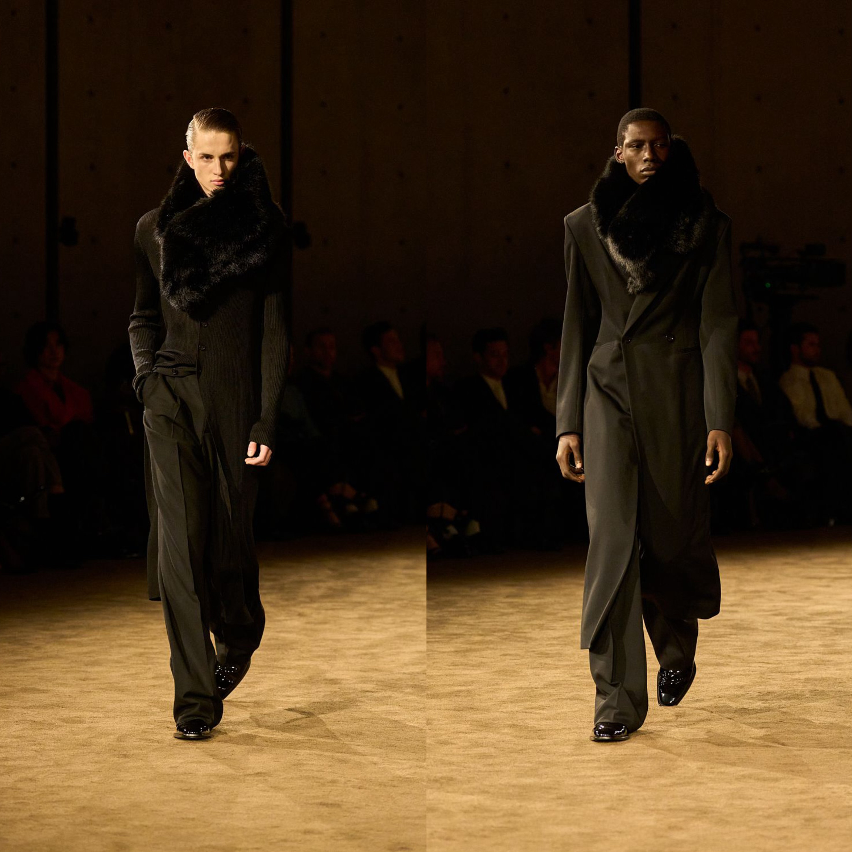 圣罗兰巴黎男装大秀黎明晨曦初临,半明半寐的过渡时刻,成为2026冬季男士时装秀灵感源泉。圣罗兰品牌创意总监Anthony Vaccarello以詹姆斯 · 鲍德温经典著作《乔瓦尼的房间》为创作原点,萃取书中离别时刻的叙事张力与幽微心绪,探寻男性魅⼒与⽓质中的亲密与脆弱,以时装的方式呈现。本系列以纤长流畅廓形与柔软褶皱纹理诠释刚柔并济。品牌标志性黑色贯穿始终,服饰廓形设计勾勒身形,标志性吸烟装以锐利剪裁彰显如铠甲般的⼒量感,利落肩线的长款西装下中短裤与高筒长靴锋芒交汇,优雅丝巾糅合细腻与洒脱,针织低领毛衣于挺拔姿态中收束锐利气场,这些独属于圣罗兰男士迷人的魅力于巴黎奏响。惊喜登场的乳胶高筒长靴紧贴腿部线条、丝巾的巧妙运用、中款西裤的优雅与潇洒、奢华象征的皮草围脖、长款针织开衫等单品成为本系列最亮眼的搭配款式,将引领新季度潮流趋势~