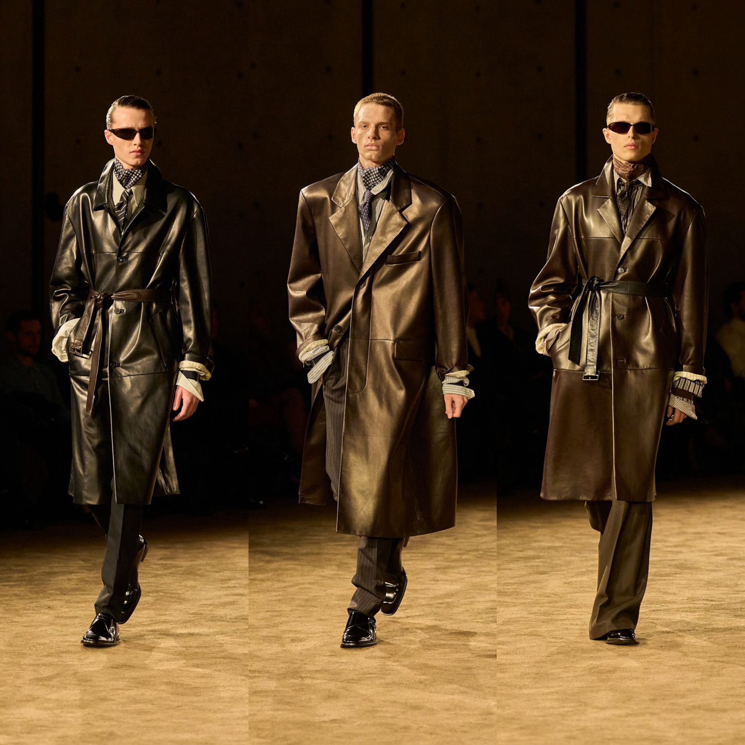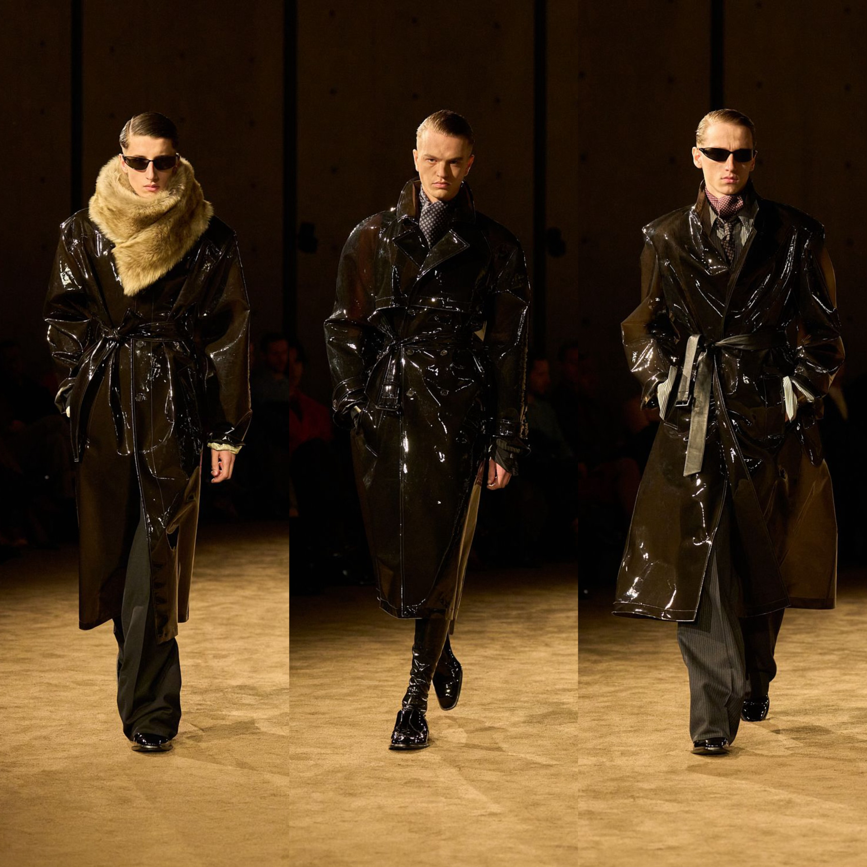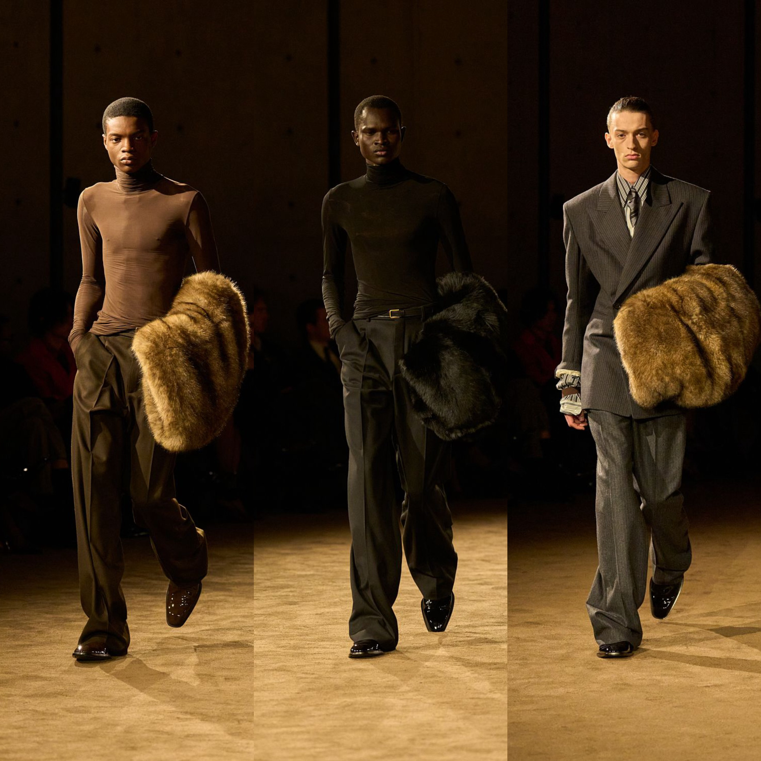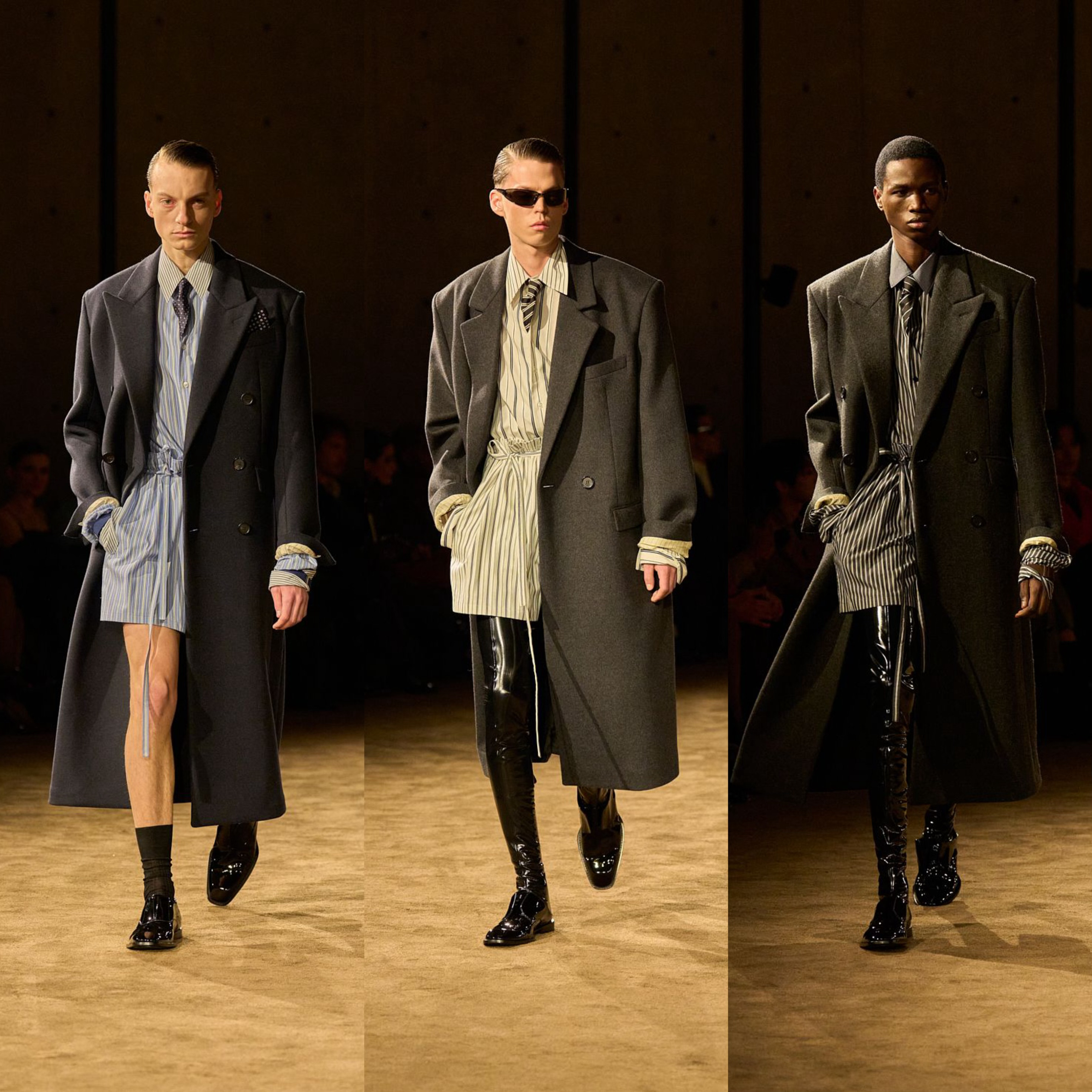 圣罗兰巴黎男装大秀黎明晨曦初临,半明半寐的过渡时刻,成为2026冬季男士时装秀灵感源泉。圣罗兰品牌创意总监Anthony Vaccarello以詹姆斯 · 鲍德温经典著作《乔瓦尼的房间》为创作原点,萃取书中离别时刻的叙事张力与幽微心绪,探寻男性魅⼒与⽓质中的亲密与脆弱,以时装的方式呈现。本系列以纤长流畅廓形与柔软褶皱纹理诠释刚柔并济。品牌标志性黑色贯穿始终,服饰廓形设计勾勒身形,标志性吸烟装以锐利剪裁彰显如铠甲般的⼒量感,利落肩线的长款西装下中短裤与高筒长靴锋芒交汇,优雅丝巾糅合细腻与洒脱,针织低领毛衣于挺拔姿态中收束锐利气场,这些独属于圣罗兰男士迷人的魅力于巴黎奏响。惊喜登场的乳胶高筒长靴紧贴腿部线条、丝巾的巧妙运用、中款西裤的优雅与潇洒、奢华象征的皮草围脖、长款针织开衫等单品成为本系列最亮眼的搭配款式,将引领新季度潮流趋势~