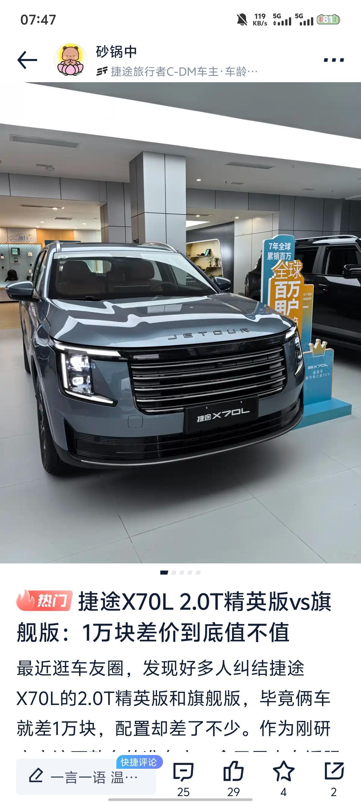 X70L哪个版本带小桌板? 捷途X70L(2025/2026款)1.5T 7DCT豪华型和2.0T 8AT旗舰型(含5座/7座)标配第二排小桌板,承重30kg;1.5T标准型、舒适型与2.0T精英型均无此配置 。 😎大白话点评:小桌板对带娃或后排临时办公的人很实用,30kg承重放电脑、餐食都稳,折叠后不占空间。但这俩配置价格更高,1.5T豪华型比舒适型贵1万,2.0T旗舰型比精英型贵1万,得看你愿不愿为这配置多花钱。 💡总结:追求小桌板,直接选1.5T豪华型或2.0T旗舰型;预算有限且不刚需,选其他配置更划算。【来自懂车帝车友圈】