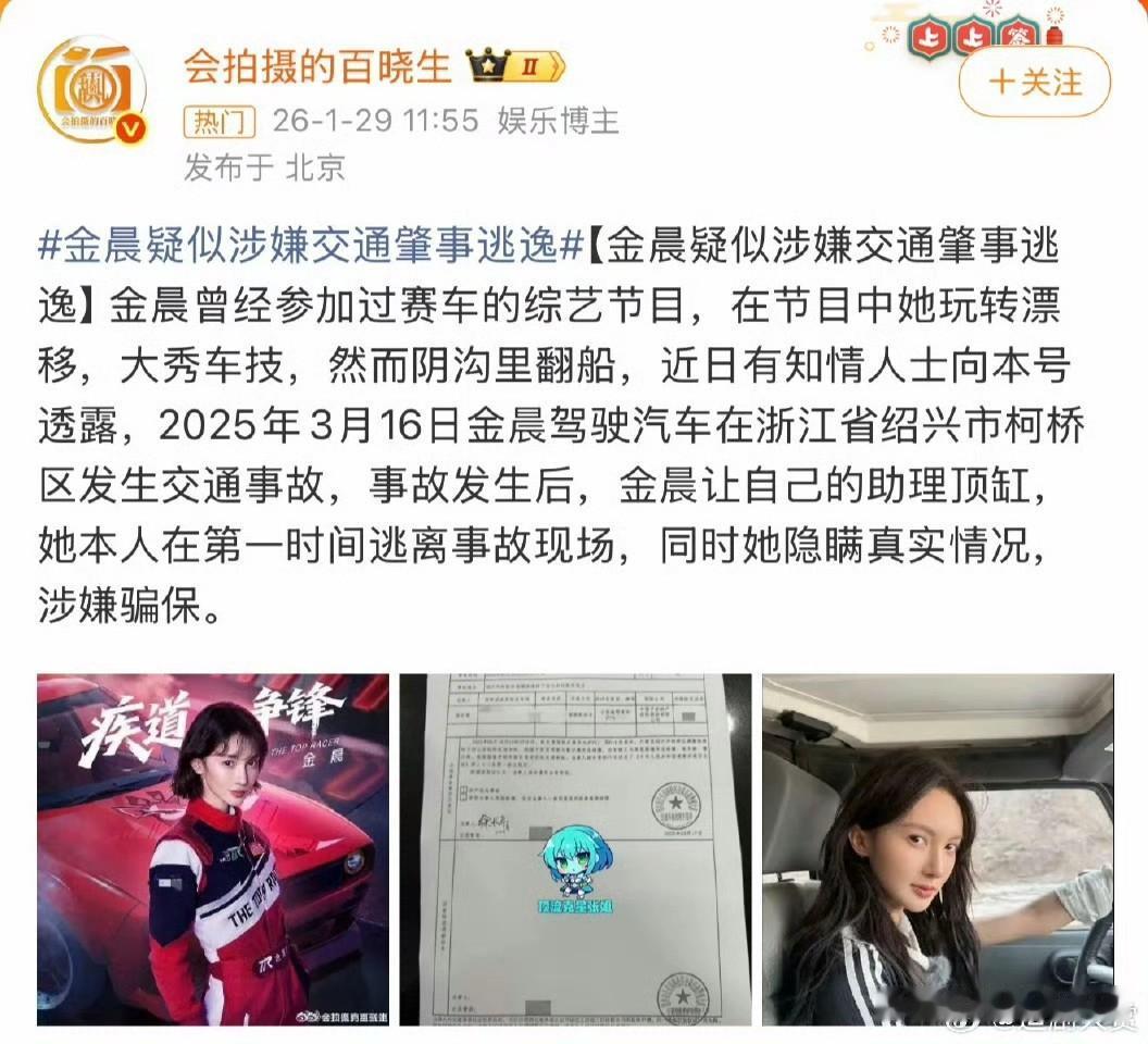 金晨被曝光肇事逃逸!感觉不像是真的,理由很简单,一是现在到处有摄像头肇事了很难逃得掉,二是她作为公众人物如果属实等于是在拿自己事业开玩笑,个人觉得她这样做得概率非常低,无限接近于0。 很可能是,确实肇事了,但是没有逃逸,自己工作太忙,但是留下了人处理,被误会了也不是没有可能,如果属实,那她就是玩火自焚,自毁长城,事业毁了也是咎由自取,不值得同情。 值得一提的是,她和张雨绮都是山东老乡,关系非常好,所以也有人认为,她是在替张大姐分担火力,你觉得这个可能性大吗?