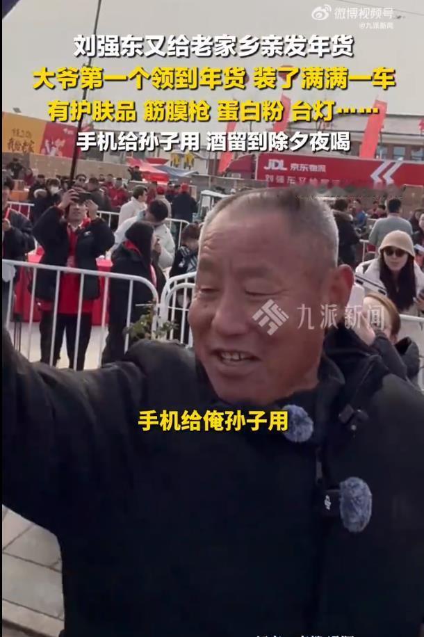 第一个领到刘强东年货大爷发声刘强东向宿迁乡亲发放年货,已成为一项持续多年的乡土传统。首位领取的大爷将手机留给孙辈、美酒留待除夕,这质朴的分配与期待,恰是这份年礼价值的真实体现——它超越了物质本身,成为连接游子与故里、传递关怀与分享的温暖纽带,在乡土人情中沉淀下独特意义。大爷领到刘强东发的酒称除夕喝