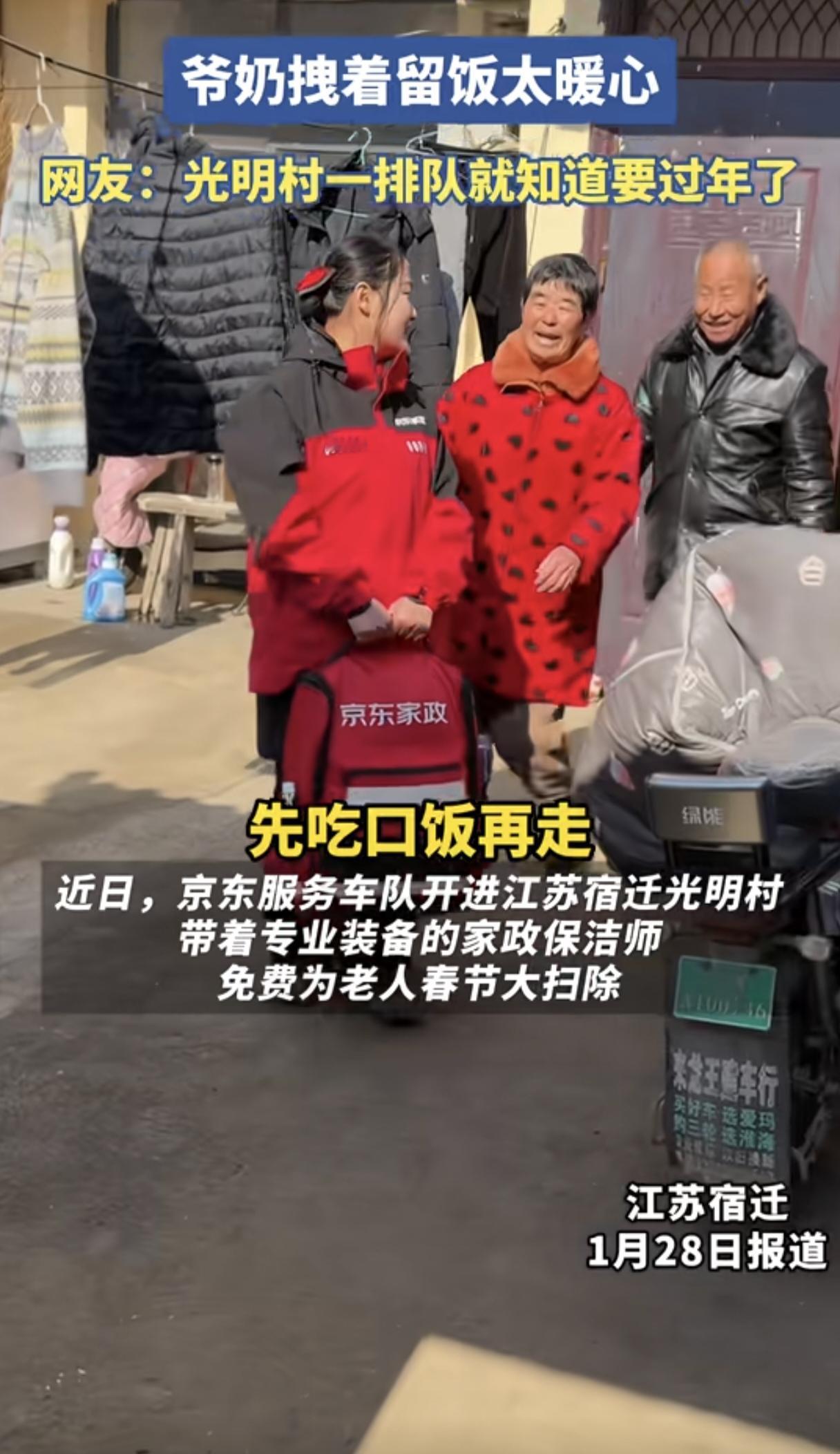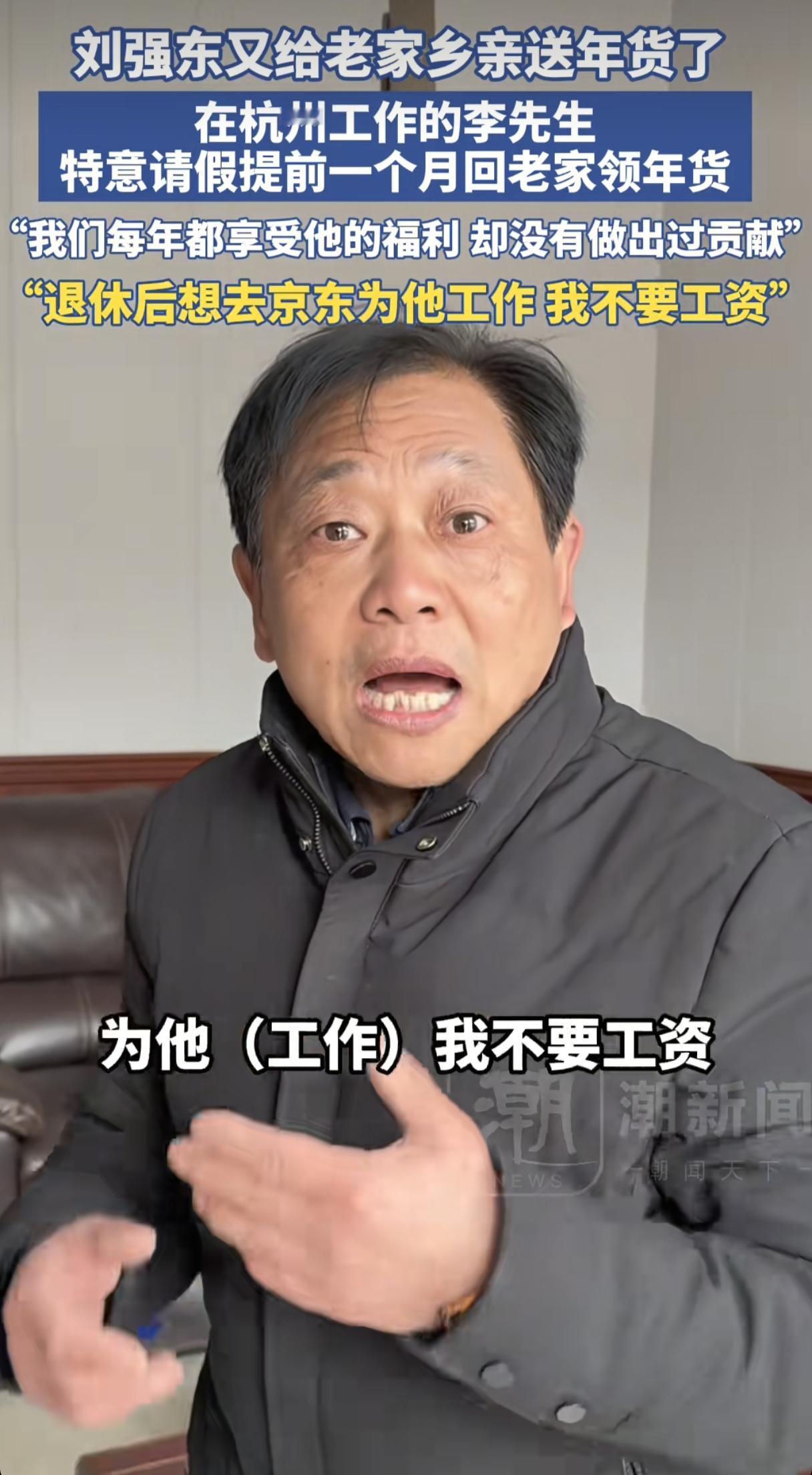 光明村村民采访时说:“要不是刘总,我们是住不了这样房子的,这个房子都是他出的钱,已经住了八九年了。”还说她从小看着刘强东长大,他从小就老实、忠厚、善良。 刘强东给大家发年货就算了,还给村民免费提供家政服务,厨房也不用自己打扫,地也不用自己拖了。 这很明显是打广告了,但是网友和村民自愿为他打广告,光明村的村民太让人羡慕了! 还有一村民采访时说:“我们每年都享受他的福利,却没有做出贡献,我就打算我以后退休了,能到京东去,为他工作,不要工资。” 可能很多儿女都不如刘强东想的周到,服务了乡亲,也做了宣传,等于两全其美,比花很多钱请明星代言强太多了! 这76个鸡蛋和500元的回报率超值!